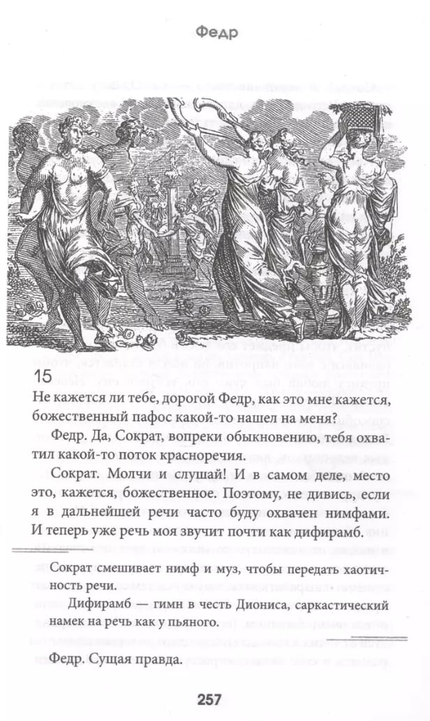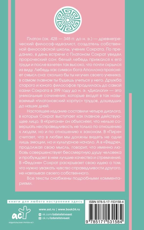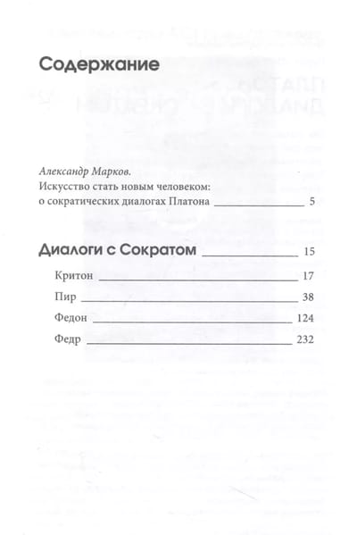 Настоящее издание составили четыре диалога, в которых Сократ выступает как главное действующее лицо. В «Критоне» он объясняет, что нельзя совершать несправедливость не только по отношению к людям, но и по отношению к законам. В «Пире» считает, что в любви мы должны видеть не одни лишь эмоции, но и культурное начало. А в «Федре», продолжая свою мысль, говорит, что именно любовь совершенствует бессмертную душу человека и пробуждает в нем лучшие качества и стремления. В «Федоне» Сократ раскрывает свою идею о том, что нужно уважать чувство справедливости другого, не навязывая своего собственного. Все тексты снабжены подробными комментариями.