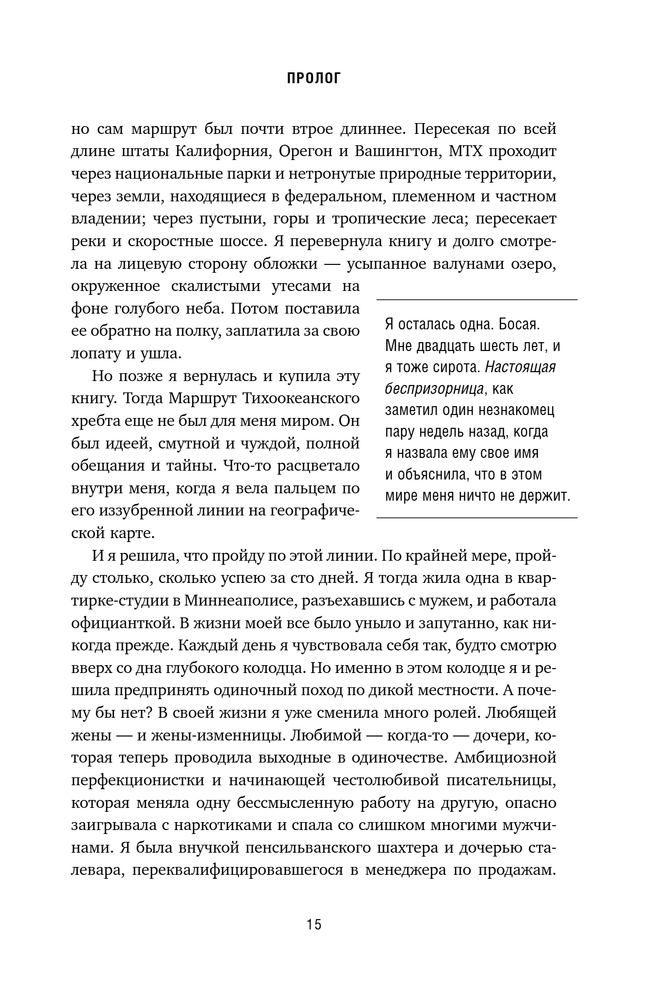 Когда жизнь становится черно-белой, когда нечего терять, нет ни цели, ни будущего, ни желания жить, люди порой решаются на отчаянные поступки. Потеряв мать, разрушив свой брак и связавшись с наркоманом, Шерил дошла до той черты, за которой зияла бездна. Ей нужна была веская причина, чтобы начать новую жизнь, перестать заниматься саморазрушением и попытаться спасти себя. И она в одиночку отправилась в пешее путешествие длиной 1770 км. Поход Шерил был не только трудным, но и опасным. Ей пришлось пройти 27 километров по палящей пустыне лишь с небольшим запасом воды, совершить несколько дневных переходов длиной в 30 километров, пройти по узкой тропе, расположенной выше 2 тысяч метров над уровнем моря, взобраться на заснеженную гору с рюкзаком, весящим 36 килограмм. Но что было сложнее – выдержать тяжелейшие условия или найти ответы на свои вопросы? Откровенный и эмоциональный рассказ женщины, преодолевшей себя, вдохновляет на наведение порядка в собственной жизни. Чтобы прийти к себе, не обязательно отправляться в путешествие, иногда достаточно лишь взглянуть со стороны на то, как это уже кто-то сделал. Полное опасностей приключение, позволило Шерил кардинально изменить свою жизнь, обрести душевное равновесие и гармонию.