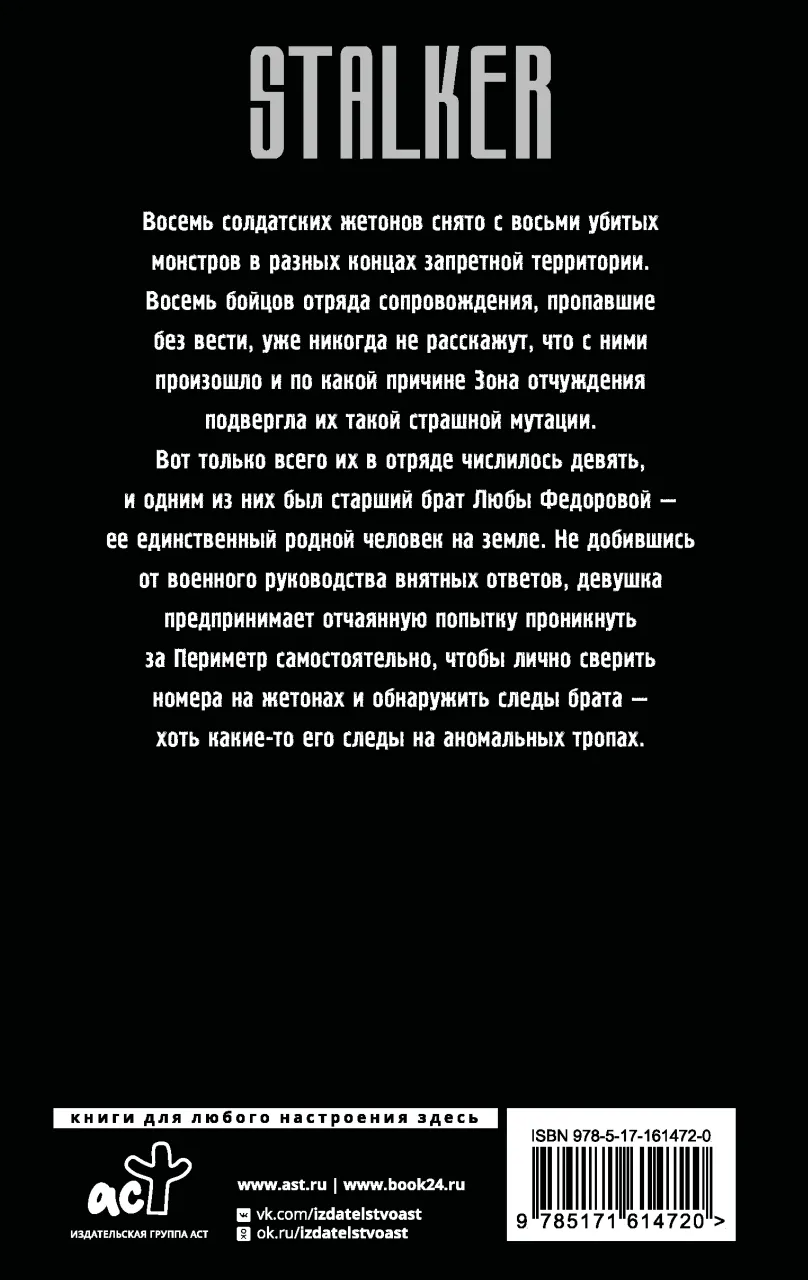 Вот только всего их в отряде числилось девять, и одним из них был старший брат Любы Федоровой — ее единственный родной человек на земле. Не добившись от военного руководства внятных ответов, девушка предпринимает отчаянную попытку проникнуть за Периметр самостоятельно, чтобы лично сверить номера на жетонах и обнаружить следы брата — хоть какие-то его следы на аномальных тропах.