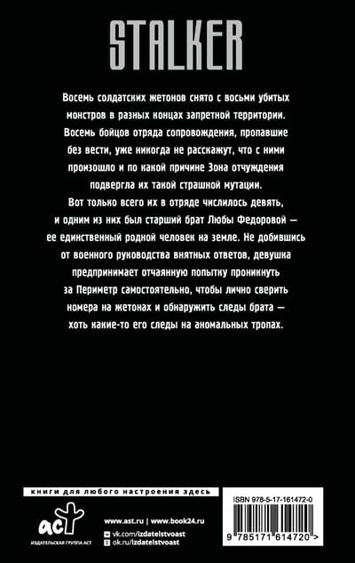 Восемь солдатских жетонов снято с восьми убитых монстров в разных концах запретной территории. Восемь бойцов отряда сопровождения, пропавшие без вести, уже никогда не расскажут, что с ними произошло и по какой причине Зона отчуждения подвергла их такой страшной мутации.