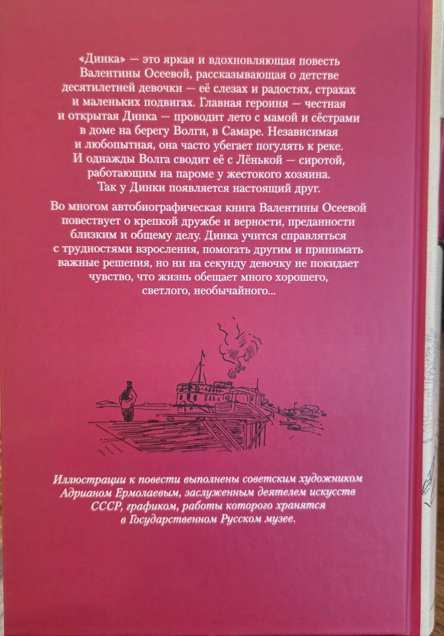 «Динка» — это яркая и вдохновляющая повесть Валентины Осеевой, рассказывающая о детстве десятилетней девочки — её слезах и радостях, страхах и маленьких подвигах. Главная героиня — честная и открытая Динка — проводит лето с мамой и сёстрами в доме на берегу Волги, в Самаре. Независимая и любопытная, она часто убегает погулять к реке. И однажды Волга сводит её с Лёнькой — сиротой, работающим на пароме у жестокого хозяина. Так у Динки появляется настоящий друг.