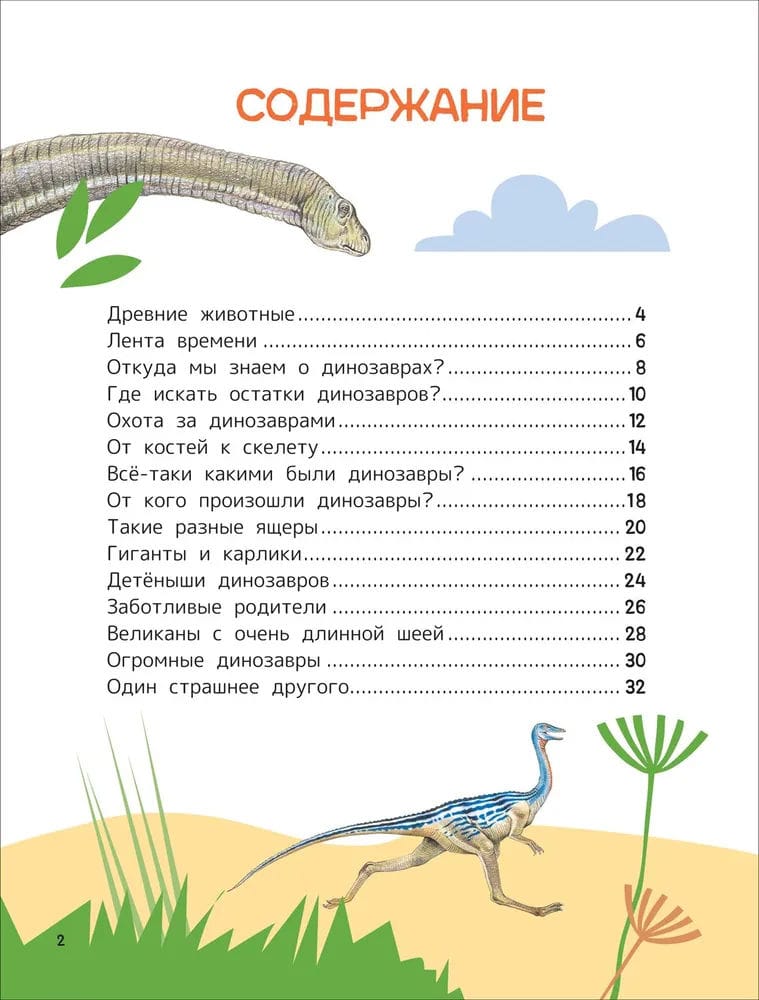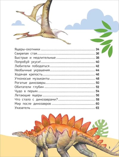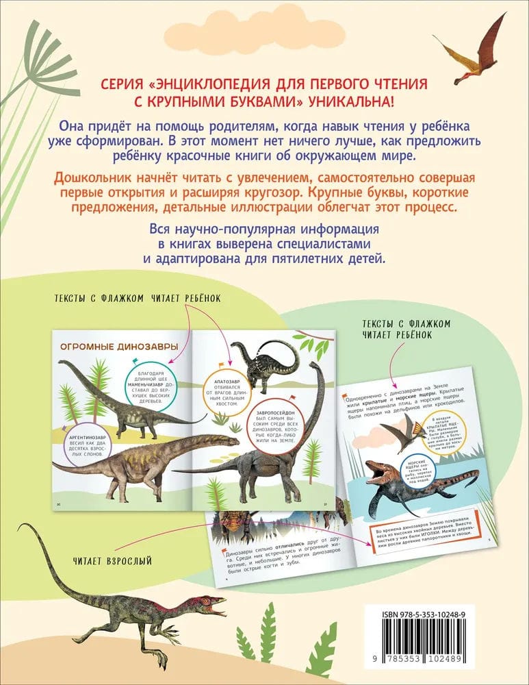 Из книги маленькие читатели узнают, когда жили динозавры, от кого они произошли, как выглядели, чем отличались друг от друга, как заботились о своих детенышах, чем питались, как защищались от врагов и отчего вымерли. Энциклопедия предназначена для совместного чтения родителей и детей. Тексты, набранные крупно и маркированные флажком, читает ребенок, а тексты на прямоугольных и круглых плашках — взрослый.