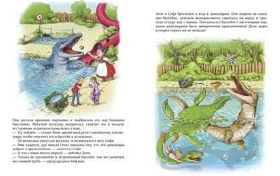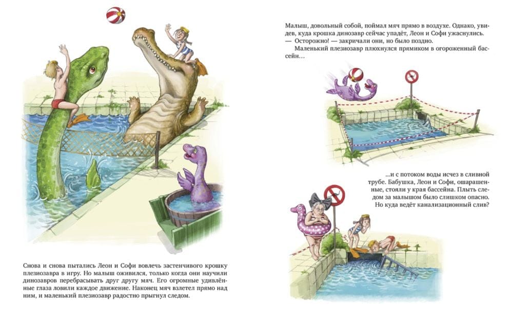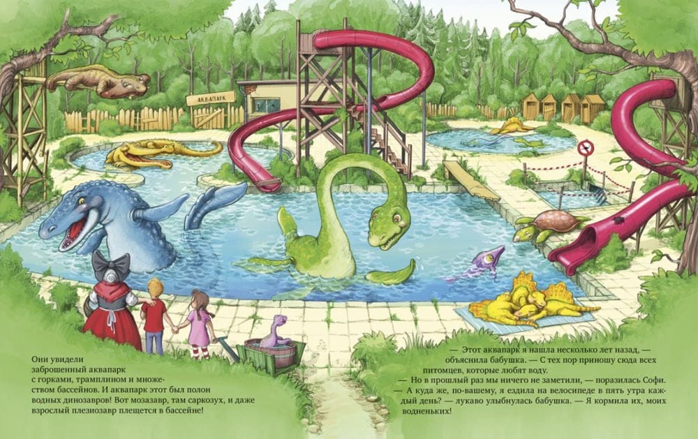 «Динозавры в аквапарке» — это вторая книга о приключениях брата, сестры, их бабушки и ее домашних динозавров. В новой истории герои познакомятся с водными гигантами и будут плескаться в бассейне с веселыми мозазавром, саркозухом и плезиозавром. У бабушки Леона и Софи есть секрет: она разводит настоящих динозавров! Для своих водоплавающих питомцев бабушка нашла идеальное место — заброшенный аквапарк посреди леса. Аквапарк обожают все — и динозавры, и ребята. Но в разгар водных развлечений так легко забыть об осторожности! Во время игры в мяч происходит страшное: маленький плезиозавр исчезает в сливной трубе. Смогут ли бабушка и ее внуки спасти малыша