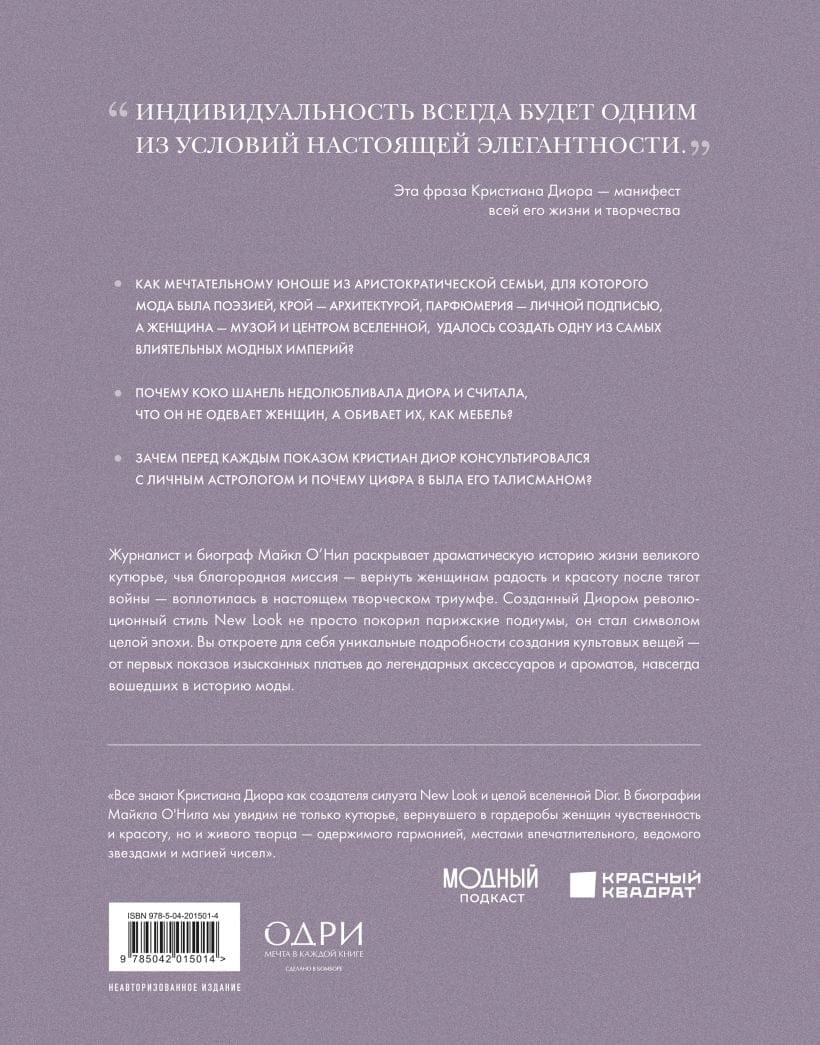 Захватывающая биография легендарного кутюрье, чья страсть к красоте и любовь к женщинам изменила мир моды навсегда. Журналист и биограф Майкл О’Нил создает увлекательную хронику жизни Кристиана Диора — от безмятежных дней на семейной вилле в живописных садах Гранвиля до создания модной империи. Книга рассказывает о том, как новаторство, уникальное видение и художественный дар Диора произвели настоящую модную революцию и позволили ему подняться на самую вершину парижского от-кутюр. Вы узнаете о тайных символах в коллекциях и личных талисманах кутюрье, которые помогали ему создавать неповторимые шедевры, откроете для себя уникальные подробности создания культовых вещей — от первых показов изысканных платьев до легендарных аксессуаров и ароматов, навсегда вошедших в историю моды.