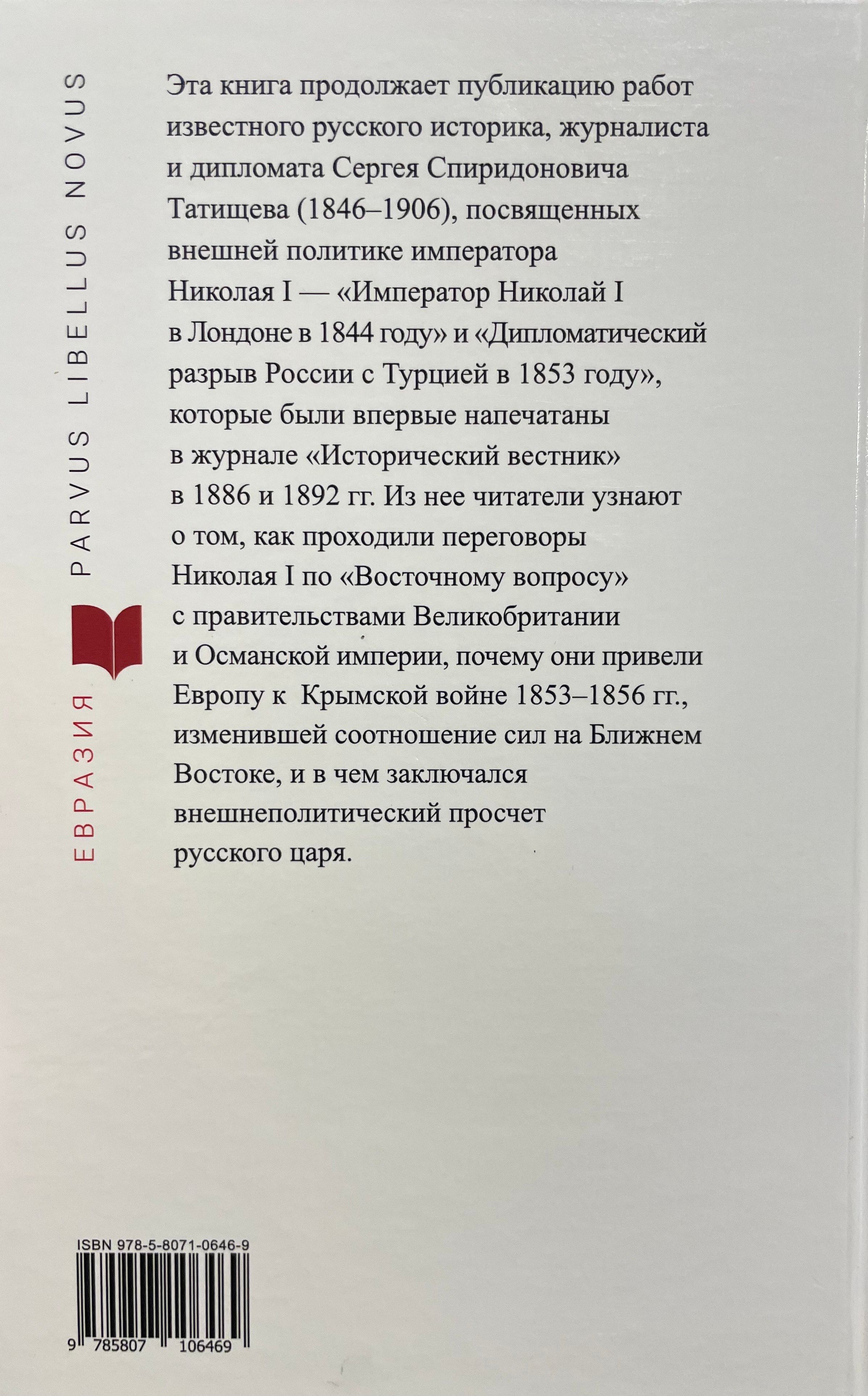 Эта книга продолжает публикацию работ известного русского историка, журналиста и дипломата Сергея Спиридоновича Татищева (1846–1906), посвященных внешней политике императора Николая I — «Император Николай I в Лондоне в 1844 году» и «Дипломатический разрыв России с Турцией в 1853 году», которые были впервые напечатаны в журнале «Исторический вестник» в 1886 и 1892 годах. Из нее читатели узнают о том, как происходили переговоры Николая I по «Восточному вопросу» с правительствами Великобритании и Османской империи, почему они привели Европу к Крымской войне 1853–1856 годов, изменившей соотношение сил на Ближнем Востоке, и в чем заключался внешнеполитический просчет русского царя.