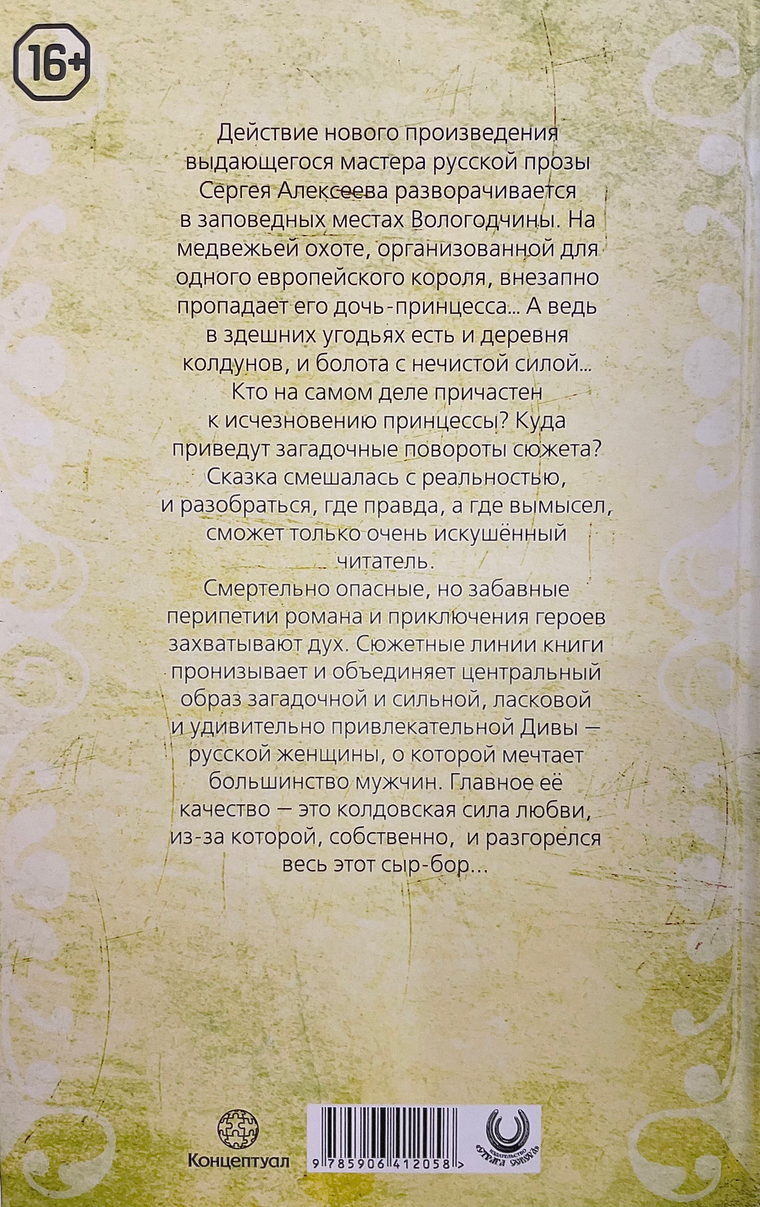 Действие нового произведения выдающегося мастера русской прозы Сергея Алексеева разворачивается в заповедных местах Вологодчины. На медвежьей охоте, организованной для одного европейского короля, внезапно пропадает его дочь-принцесса… А ведь в здешних угодьях есть и деревня колдунов, и болота с нечистой силой…