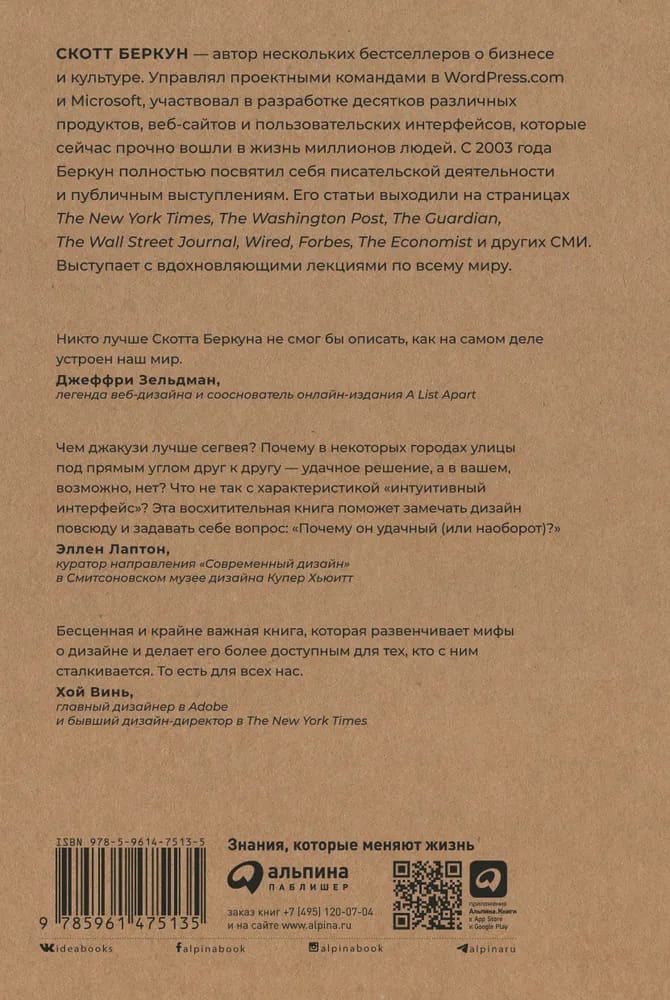 Мы редко задумываемся о том, что привычные вещи, которыми мы пользуемся каждый день, спроектированы дизайнерами: от кнопок в лифте и молотка до приложения для смартфона. Чем-то мы пользуемся с удовольствием, а что-то кажется неудобным и странным. Чтобы получился действительно функциональный и привлекательный продукт, дизайнеру нужно пройти огромный путь и ответить на массу вопросов — например, для кого эта вещь, как ее сделать удобнее и дешевле и, наконец, сможет ли она изменить жизнь к лучшему? От их решений зависит красота, удобство и безопасность нашего мира, но есть ли универсальные принципы, на которых строится выдающийся дизайн? Автор нескольких бестселлеров, дизайнер Скотт Беркун предлагает по-новому взглянуть на вещи вокруг нас и научиться отличать хорошие идеи от плохих.