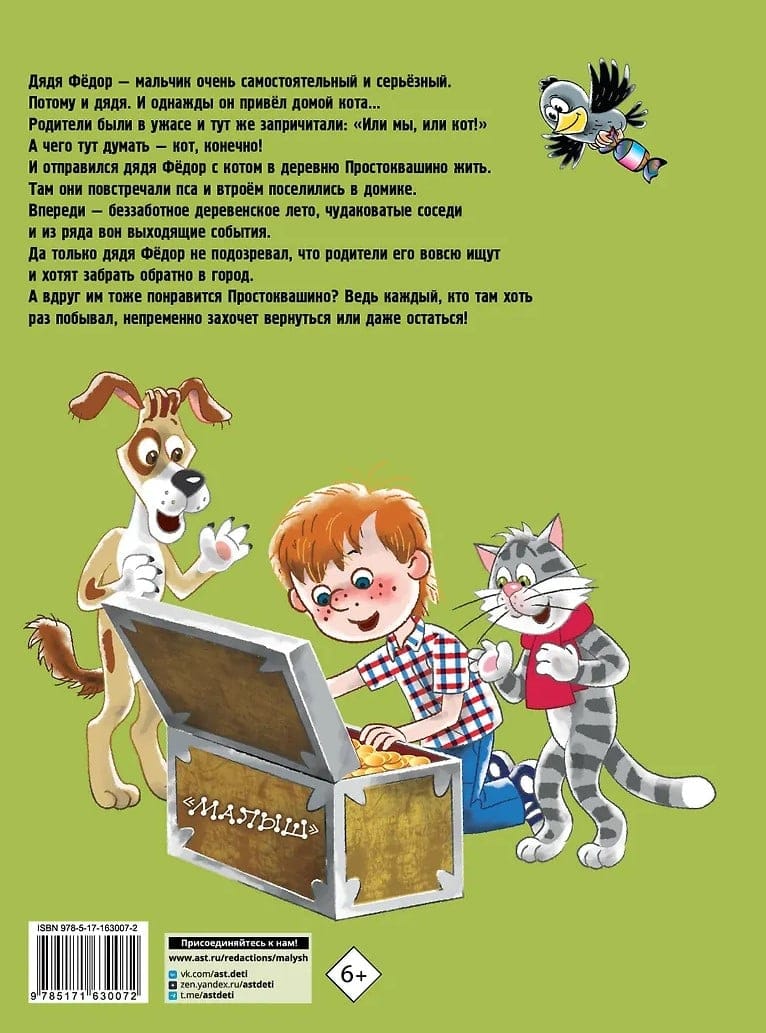 Дядя Фёдор — мальчик очень самостоятельный и серьёзный. Потому и дядя. И однажды он привёл домой кота… Родители были в ужасе и тут же запричитали: «Или мы, или кот!» А чего тут думать — кот, конечно! И отправился дядя Фёдор с котом в деревню Простоквашино жить. Там они повстречали пса и втроём поселились в домике. Впереди — беззаботное деревенское лето, чудаковатые соседи и из ряда вон выходящие события. Да только дядя Фёдор не подозревал, что родители его вовсю ищут и хотят забрать обратно в город. А вдруг им тоже понравится Простоквашино? Ведь каждый, кто там хоть раз побывал, непременно захочет вернуться или даже остаться!