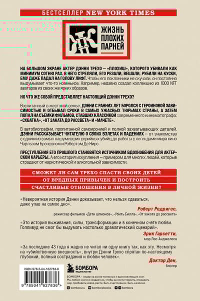 Герой или подонок? Талантливый актер или опасный преступник? Самый главный «плохиш» Голливудского кинематографа наконец-то решился откровенно поделиться своей биографией. Эта история моментально стала бестселлером «Нью-Йорк Таймс» и заслужила не одну тысячу восторженных отзывов от поклонников на Amazon.com. Книга из разряда историй про Жизнь Плохих Парней привлечет как тех читателей, которые и сами не против пойти против некоторых общепринятых правил, так и тех, кто любит читать остросюжетные житейские истории, но при этом никогда не пойдет на то, чтобы нарушить закон. На большом экране актер Дэнни Трехо — злодей, которого убивали как минимум сотню раз. В него стреляли, его резали, вешали, рубили на куски, ему даже падал на голову лифт. Чтобы его поклонники не скучали, он постоянно выдумывает что-то новенькое. Например, недавно создал коллекцию из 1000 NFT аватаров из своих киношных образов. Но что же из себя представляет настоящий Дэнни Трехо?