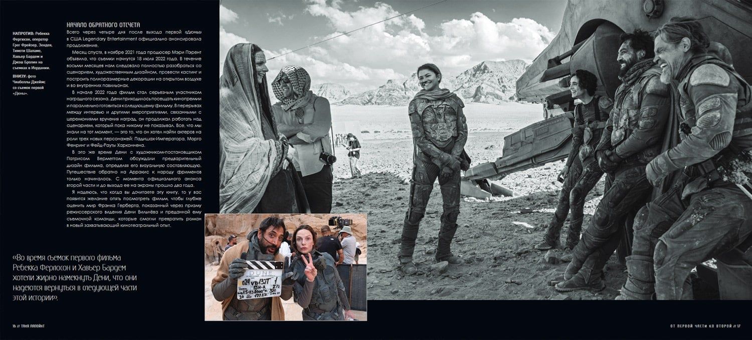 «Дюна» — торжество кинематографа. Фантастические миры Арракиса оживают не только на экранах, но и на страницах этой книги. Жена режиссера, Таня Лапойнт, честно расскажет, чего стоило Дени Вильнёву снять вторую часть. Свежие интервью со съемочной группой и актерами позволят окунуться в атмосферу съемочной площадки и буквально воочию увидеть, как создавался этот масштабный шедевр. Тимоти Шаламе, Ребекка Фергюсон, Оскар Айзек, Джейсон Момоа, Зендея и Флоренс Пью поделятся своими переживаниями и историями о работе над одним из самых громких проектов последних десятилетий. Эта книга — уникальная коллекция концепт-артов и эксклюзивных фотографий со съемок. Самая подробная, полная и впечатляющая хроника создания одного из ключевых фильмов поколения. Завораживающий мир фильма «Дюна: Часть вторая» в большом красочном артбуке «Дюна. Иллюстрированная история создания классики научной фантастики. Том 2». Подарочное издание с помощью мелованной бумаги и качественной печати передает все краски неповторимой красоты мира Дени Вильнёва.