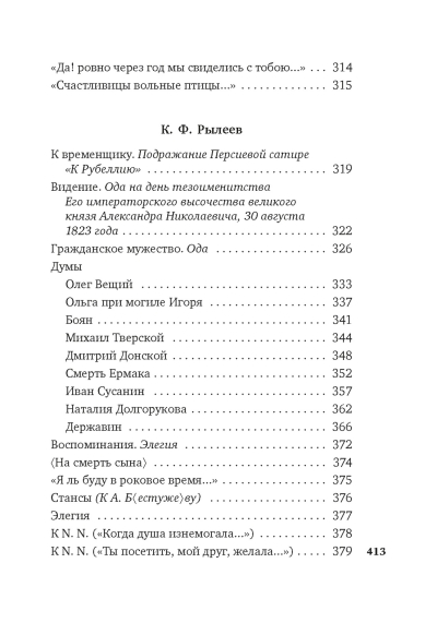В книгу включены сочинения поэтов-декабристов (К. Ф. Рылеева, В. К. Кюхельбекера, А. И. Одоевского и других), а также стихотворения А. С. Пушкина, посвященные декабристам. Большая часть этих произведений не переиздавалась более шестидесяти лет.