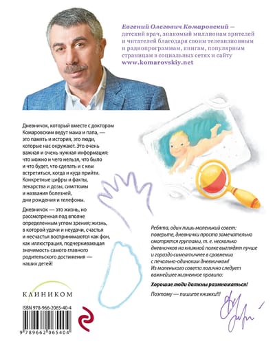 «Дневничок: наши заметки о нашем ребенке» от доктора Комаровского поможет мамам и папам фиксировать важные события в жизни ребенка, планировать занятия и иметь под рукой все необходимые контакты, даты и сведения. Этот дневничок рассчитан на разные периоды взросления малыша — от первых дней жизни и пребывания в роддоме вплоть до школьных лет. В специальных разделах предусмотрены места для заметок о купании и кормлении, увлечениях и вкусах ребенка, его прогулках и путешествиях, прививках и болезнях, праздниках и друзьях. Кроме того, в дневничке доктора Комаровского есть страницы, посвященные беременности и подготовке к родам, а также полезные подсказки, адресованные родителям.