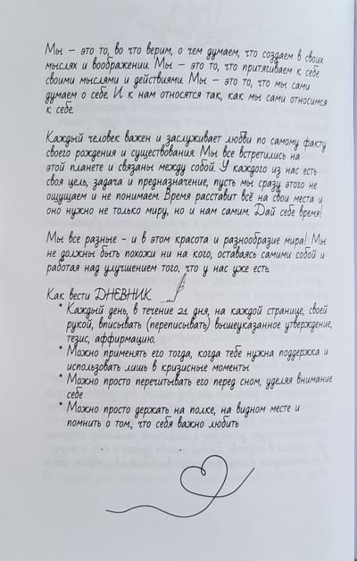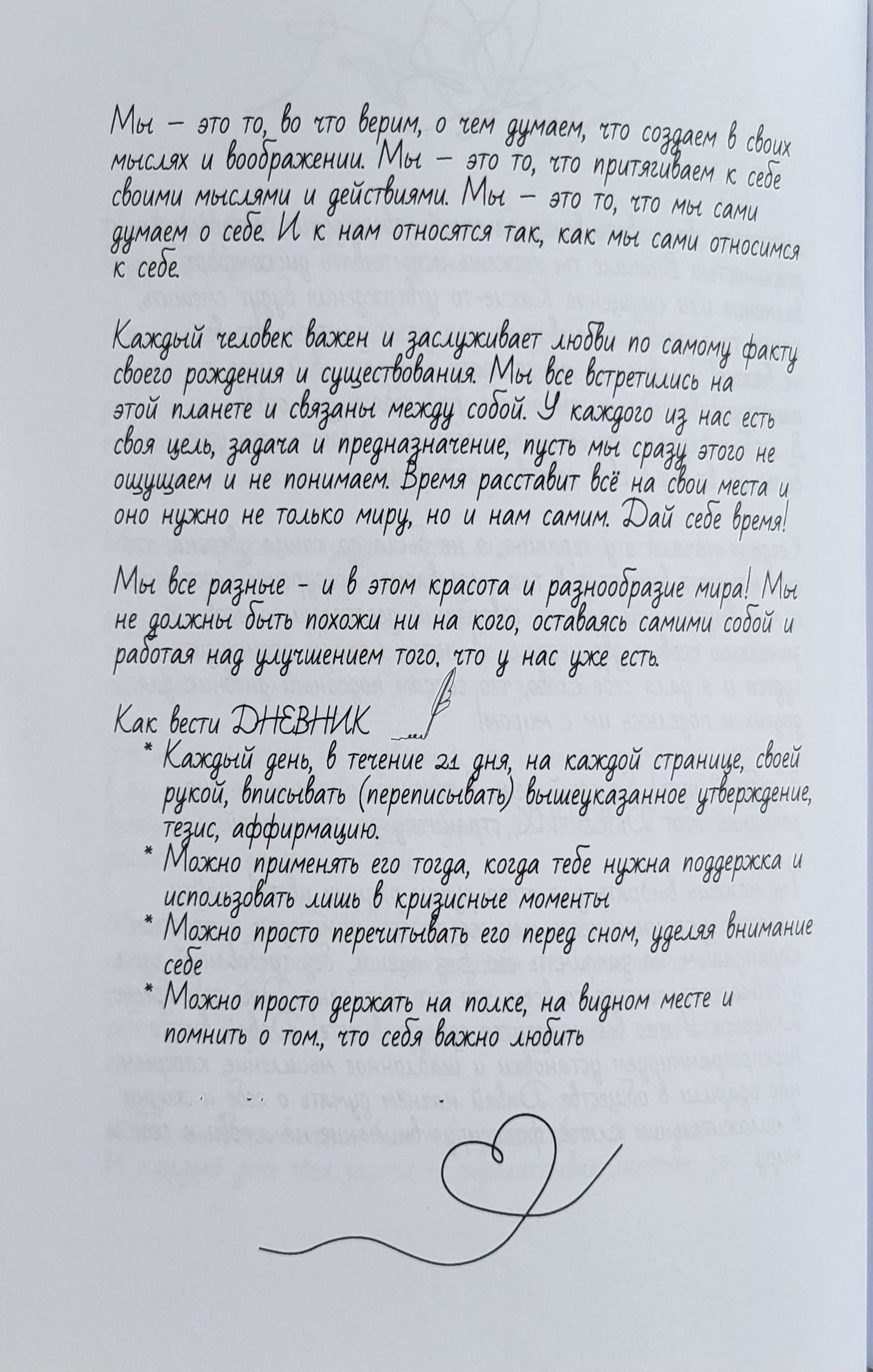 У этого дневника нет срока давности, как и нет «правильного возраста», на который он рассчитан. Он подойдет школьнице, девушке, женщине и его смело можно дарить даже своим бабушкам. Положительные мысли, установки и аффирмации творят чудеса. А мы, каждый из нас - творцы своего личного чуда.