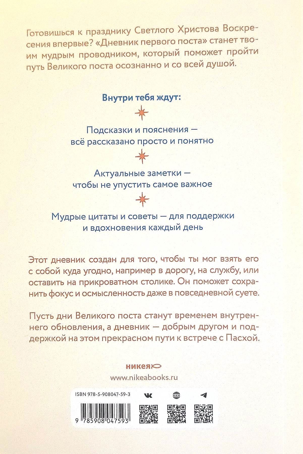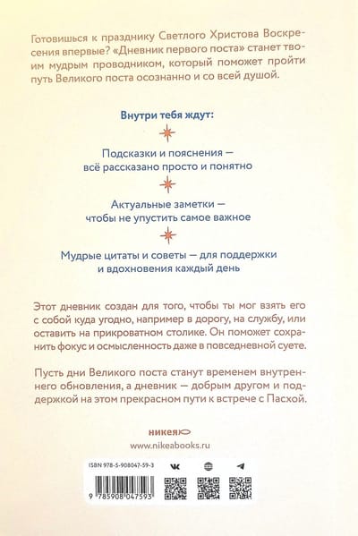 Готовишься к празднику Светлого Христова Воскресения впервые? «Дневник первого поста» станет твоим мудрым проводником, который поможет пройти путь Великого поста осознанно и со всей душой. Этот дневник создан для того, чтобы ты мог взять его с собой куда угодно, например в дорогу, на службу, или оставить на прикроватном столике. Он поможет сохранить фокус и осмысленность даже в повседневной суете. Пусть дни Великого поста станут временем внутреннего обновления, а дневник — добрым другом и поддержкой на этом прекрасном пути к встрече с Пасхой.