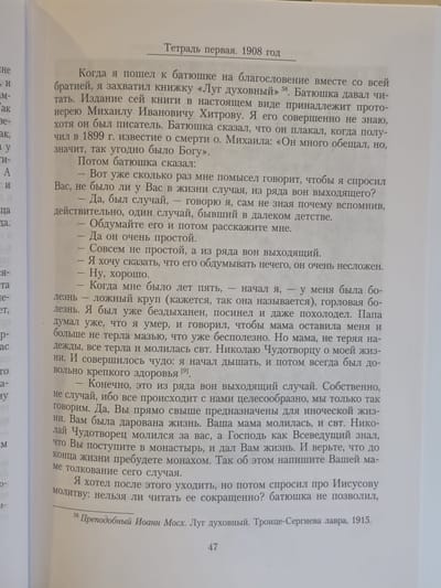 Дневник показывает, как постепенно происходит духовное возрастание молодого послушника, истинно преданного ученика старца Варсонофия, и помогает понять, сколь велико значение духовного старческого руководства в деле спасения человека.