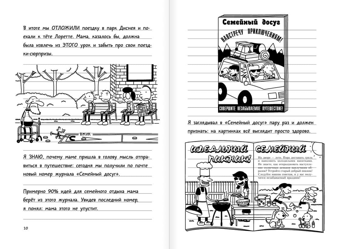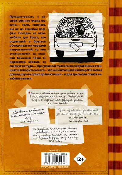 Путешествовать с семьёй обычно очень весело… если, конечно, вы не из семейки Хэффли. Поездка на автомобиле для Грега, его родителей и братьев оборачивается чередой неприятностей: то они сталкиваются со стайкой бешеных чаек; то поросёнок сбежит, то свернут не туда… Про ужасные туалеты на заправочных станциях и говорить нечего – это же настоящий кошмар! Но любая долгая дорога сулит приключения – и для Грега они станут незабываемыми.