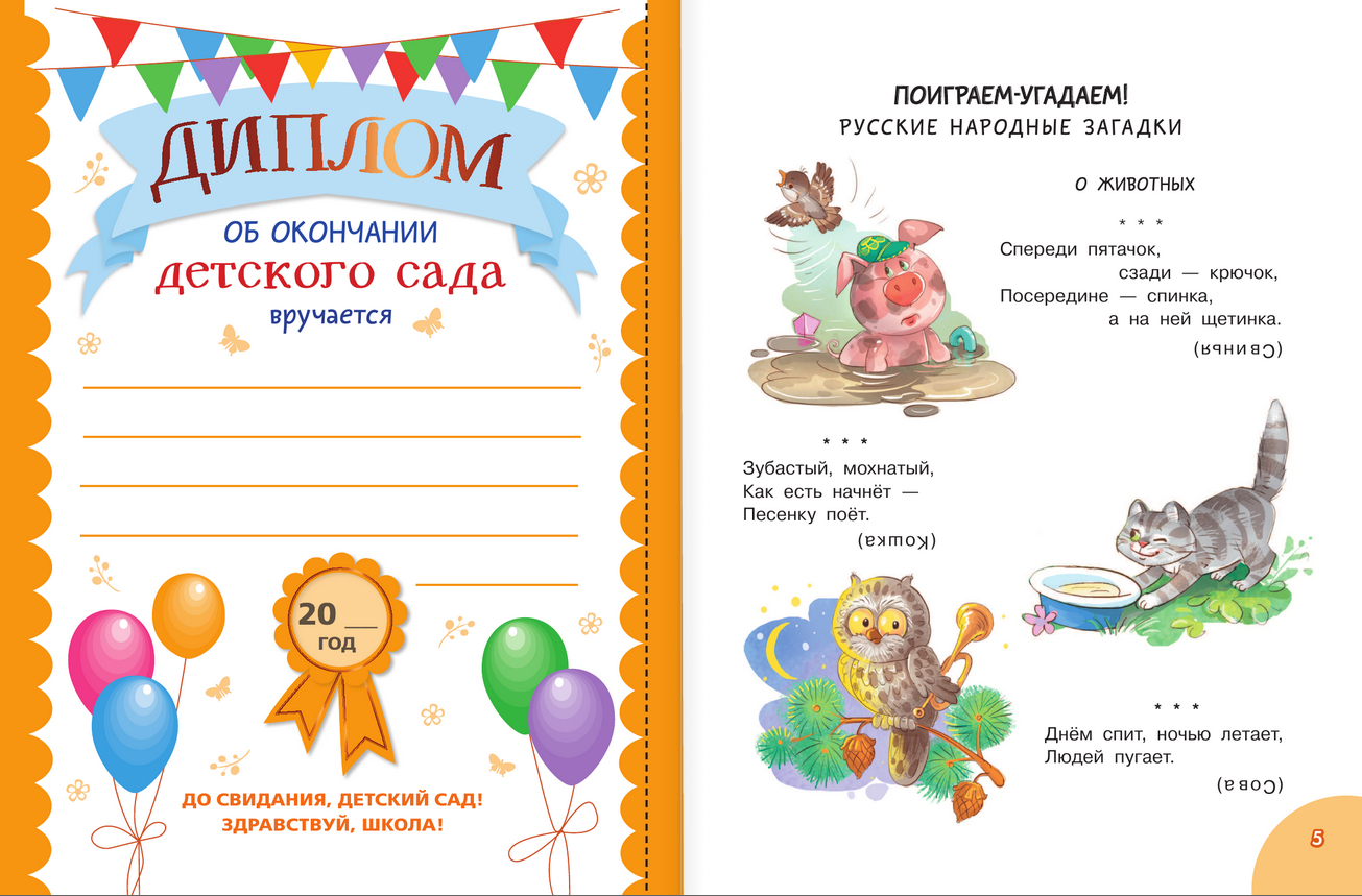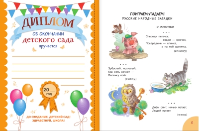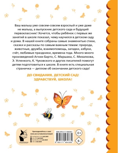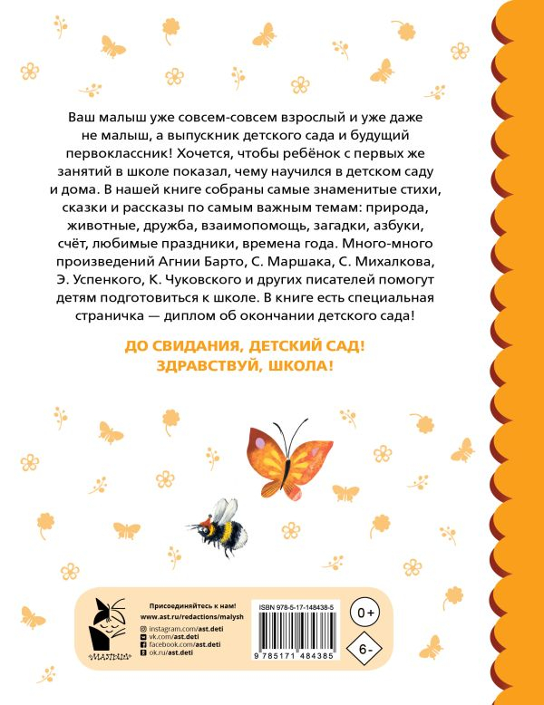 В книгу «До свидания, детский сад!» вошли сказки, стихи, рассказы, которые составляют литературный багаж дошкольника. Знакомство с русскими народными сказками, загадками, сказками В. Сутеева, Э. Успенского, В. Бианки, Х.К. Андерсена, Шарля Перро и других писателей классиков, стихами А.С. Пушкина, Ф.И. Тютчева, С. Маршака, С. Михалкова и других поэтов, с рассказами М. Пришвина, В. Драгунского, М. Зощенко, Ю. Коваля и других знаменитых авторов раширит кругозор ребёнка и поможет ему подготовиться к школе. В книгу вошли произведения, охватывающие самые важные темы для будущих первоклассников: природа, животные, дружба, взаимопомощь, загадки, азбуки, первый счёт, любимые праздники, времена года. В книге есть специальная страничка — диплом об окончании детского сада!