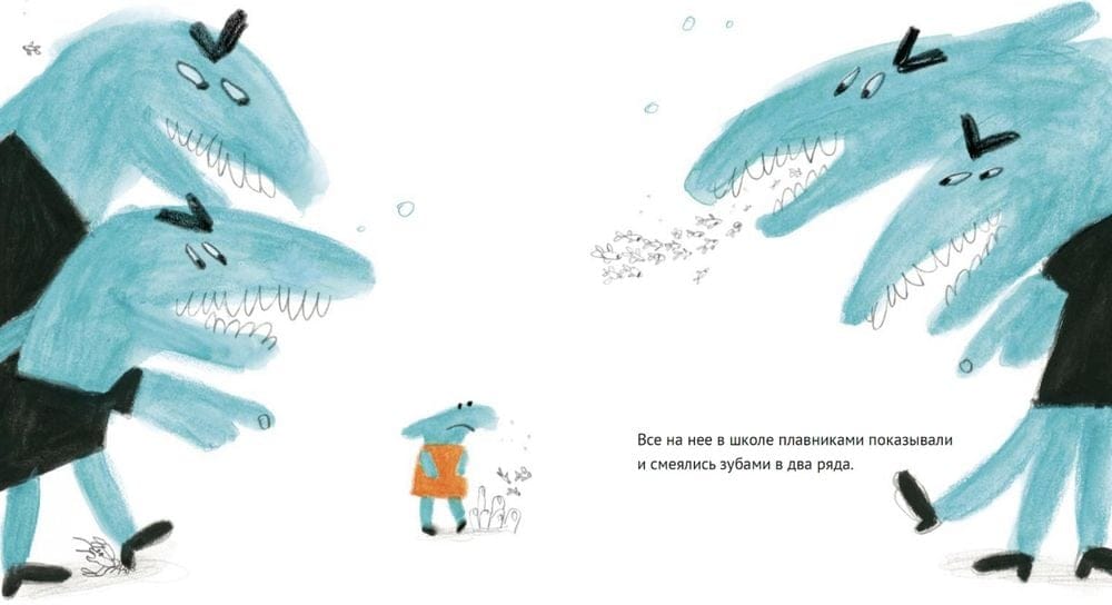 Одна маленькая акула совсем не хочет быть такой, как все. Она не желает есть водолазов, кусаться и пугать. Но быть особенной нелегко: сверстники дразнят, учителя негодуют, родители вздыхают. Остается только смириться и притворяться. Но вдруг в библиотечной книге маленькая акула находит свою «добрую» родственницу – и это все меняет.