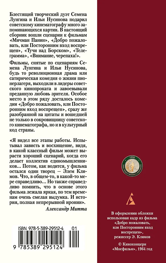 Фильмы, снятые по сценариям Семена Лунгина и Ильи Нусинова, будь то сатирическая комедия о жизни пионерлагеря или революционная драма, выходили в лидеры советского кинопроката и завоевывали преданную любовь зрителя. Особое место в этом ряду досталось комедии «Добро пожаловать, или Посторонним вход воспрещен», сразу же разобранной на цитаты и вошедшей не только в сокровищницу советского кинематографа, но и в культурный код России.