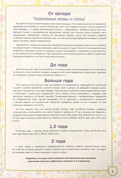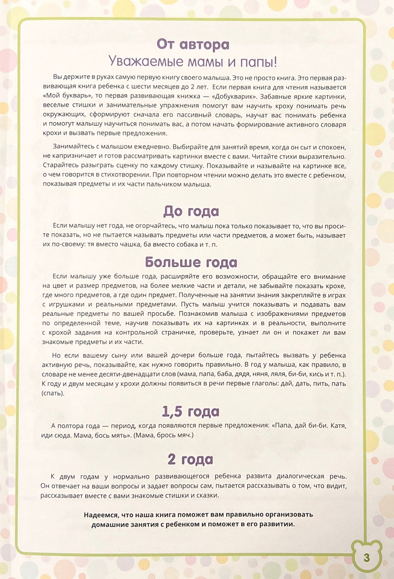 «Добукварик» — это первая обучающая книга ребенка c шести месяцев до двух лет. Если первая книга для чтения называется «Мой букварь», то первая развивающая книжка — «Добукварик». Забавные яркие картинки, веселые стишки и занимательные упражнения помогут взрослым научить кроху понимать речьокружающих, сформируют сначала его пассивный словарь, научат взрослых понимать ребенка, и помогут малышу научиться понимать окружающих, а потом помогут начать формирование активного словаря крохи и вызвать первые предложения. В издательстве «ДЕТСТВО-ПРЕСС» разработаны также «Добукварик»для детей с 2 до 4 лет и «Мой букварь». Рекомендовано родителям дошкольников и педагогам детских развивающих центров.