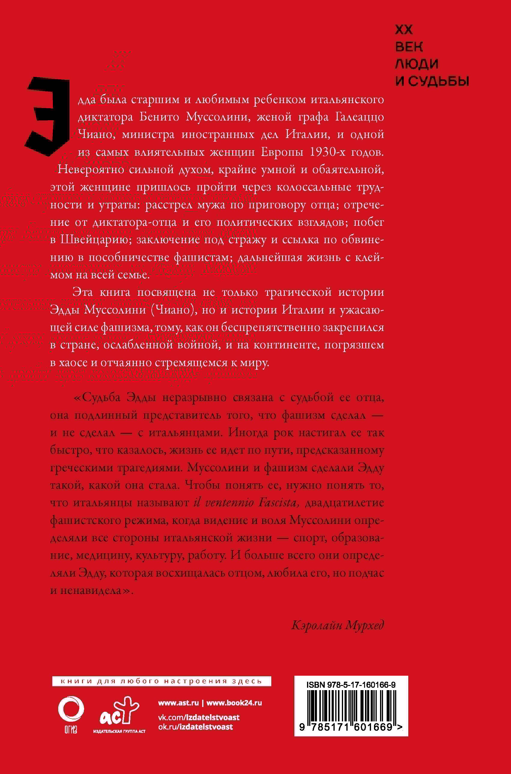 Эдда была старшим и любимым ребенком итальянского диктатора Бенито Муссолини, женой графа Галеаццо Чиано, министра иностранных дел Италии, и одной из самых влиятельных женщин Европы 1930-х годов. Невероятно сильной духом, крайне умной и обаятельной, этой женщине пришлось пройти через колоссальные трудности и утраты: расстрел мужа по приговору отца; отречение от диктатора-отца и его политических взглядов; побег в Швейцарию; заключение под стражу и ссылка по обвинению в пособничестве фашистам; дальнейшая жизнь с клеймом на всей семье.