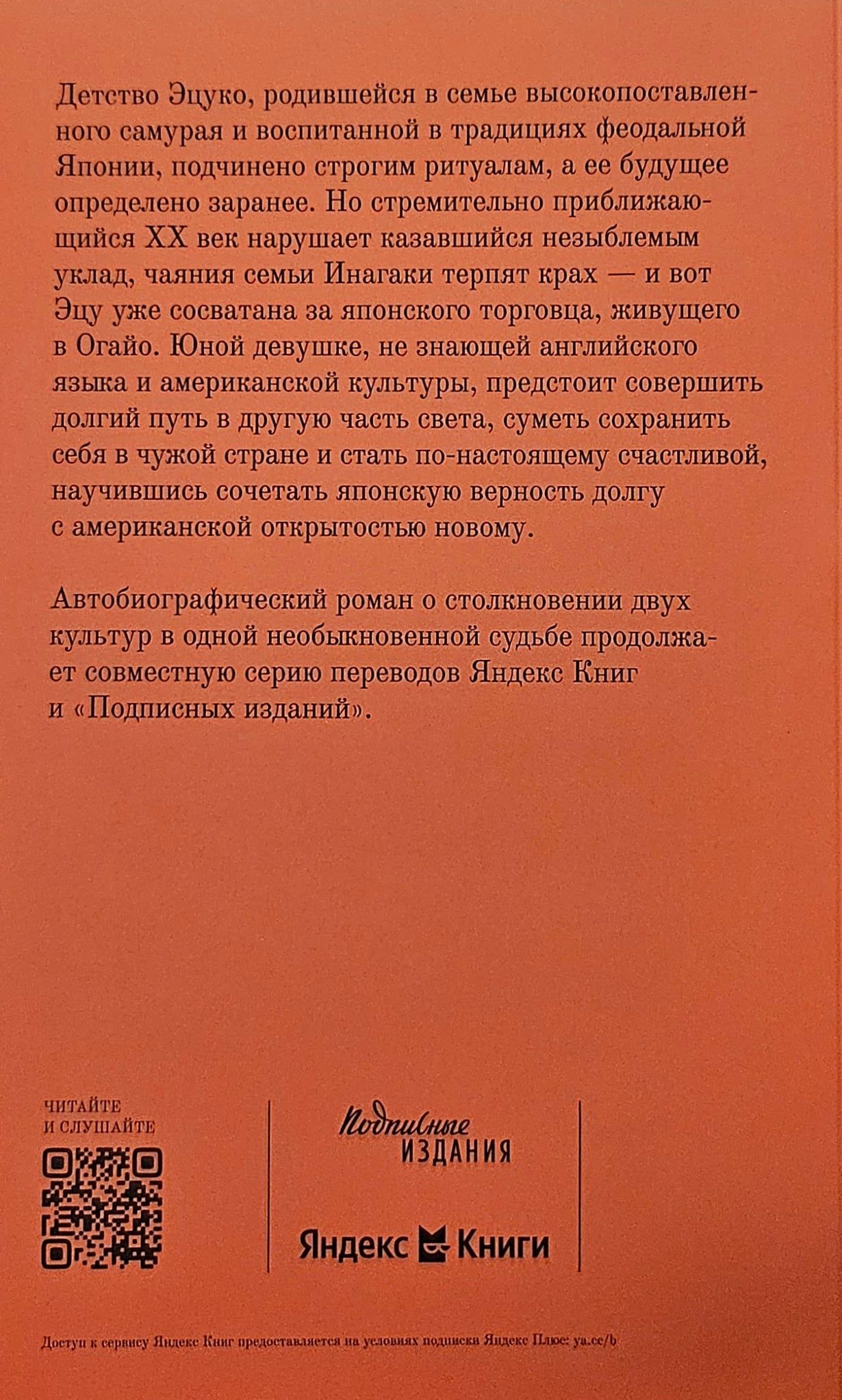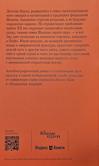 Детство Эцуко, родившейся в семье высокопоставленного самурая и воспитанной в традициях феодальной Японии, подчинено строгим ритуалам, а ее будущее определено заранее. Но стремительно приближающийся XX век нарушает казавшийся незыблемым уклад, чаяния семьи Инагаки терпят крах — и вот Эцу уже сосватана за японского торговца, живущего в Огайо. Юной девушке, не знающей английского языка и американской культуры, предстоит совершить долгий путь в другую часть света, суметь сохранить себя в чужой стране и стать по-настоящему счастливой, научившись сочетать японскую верность долгу с американской открытостью новому.
