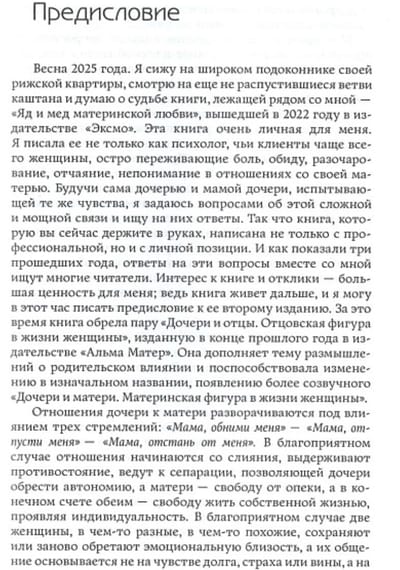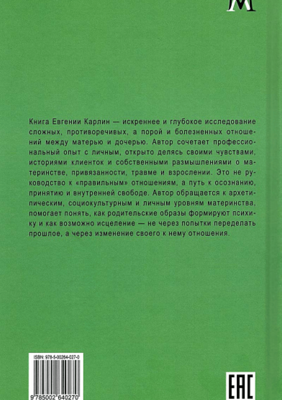 Книга Евгении Карлин — искреннее и глубокое исследование сложных, противоречивых, а порой и болезненных отношений между матерью и дочерью. Автор сочетает профессиональный опыт с личным, открыто делясь своими чувствами, историями клиенток и собственными размышлениями о материнстве, привязанности, травме и взрослении. Эго не руководство к «правильным» отношениям, а путь к осознанию, принятию и внутренней свободе.
