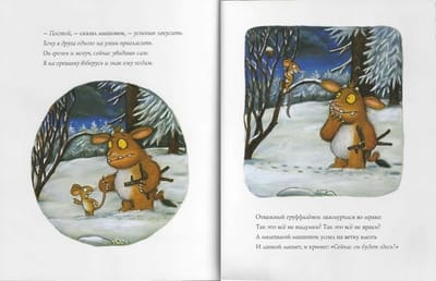 «– В соседний лес нам ходу нет, опасен он для нас. – Опасен? Почему? – Там, в чаще непроглядной, Живет Мышонок, страшный зверь, лихой и беспощадный». …Так сказал папаша Груффало, но однажды ночью малютка-груффало обошла весь запретный лес, и вдоль и поперёк, спрашивала у лисы, совы и змеи, но грозного зверя не нашла. Теперь она знает, что все дурачили её и никакого страшного Мышонка не бывает… Или бывает?
