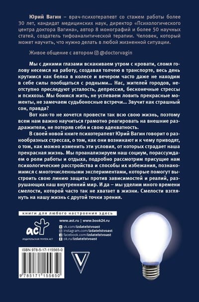В своей новой книге психотерапевт Юрий Вагин говорит о разнообразных стрессах, о том, как они возникают и к чему приводят, о том, как можно изменить эти условия, от которых страдает наша прекрасная жизнь. Мы проанализируем наш социум, порассуждаем о роли работы и отдыха, подробно рассмотрим присущие нам психологические расстройства и способы их избежания, познакомимся с многочисленными экспериментами, которые помогут выстроить свою линию защиты против зависимостей и реалий, разрушающих наш внутренний мир. И да — мы уделим много времени смелости, которой часто так не хватает в жизни. Смелости взглянуть на нашу жизнь с другой точки зрения.