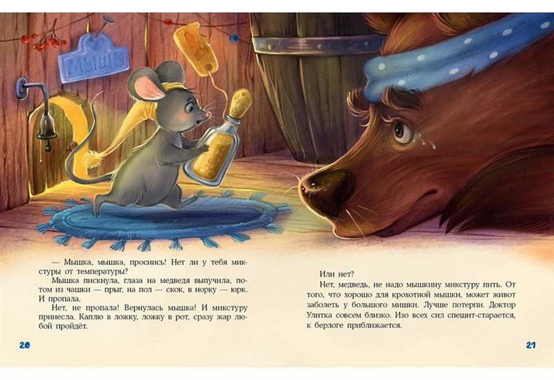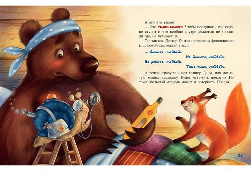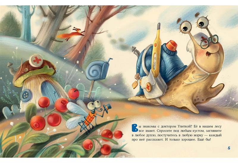 Доктора Улитку знает каждый лесной житель! Она и занозу из носа у волка вытащила, и ёжику все больные иголки вылечила, а теперь спешит-ползёт к медведю — у бедняги сильный жар… До берлоги путь небыстрый — с пригорка на горку, с листочка на кочку, — но чудесный доктор обязательно доберётся и поможет мохнатому пациенту!
