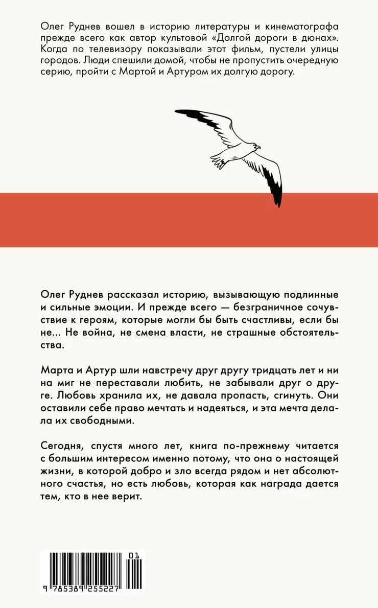 Когда по телевизору показывали «Долгую дорогу в дюнах», пустели улицы городов. Олег Руднев рассказал историю, вызывающую подлинные и сильные эмоции. И прежде всего — безграничное сочувствие к героям, которые могли бы быть счастливы, если бы не… Не война, не смена власти, не страшные обстоятельства. Марта и Артур шли навстречу друг другу тридцать лет и ни на миг не переставали любить, не забывали друг о друге. Любовь хранила их, не давала пропасть, сгинуть. Они оставили себе право мечтать и надеяться, и эта мечта делала их свободными. Сегодня, спустя много лет, книга по-прежнему читается с большим интересом, именно потому, что она о настоящей жизни, в которой добро и зло всегда рядом и нет абсолютного счастья, но есть любовь, которая, как награда, дается тем, кто в нее верит.