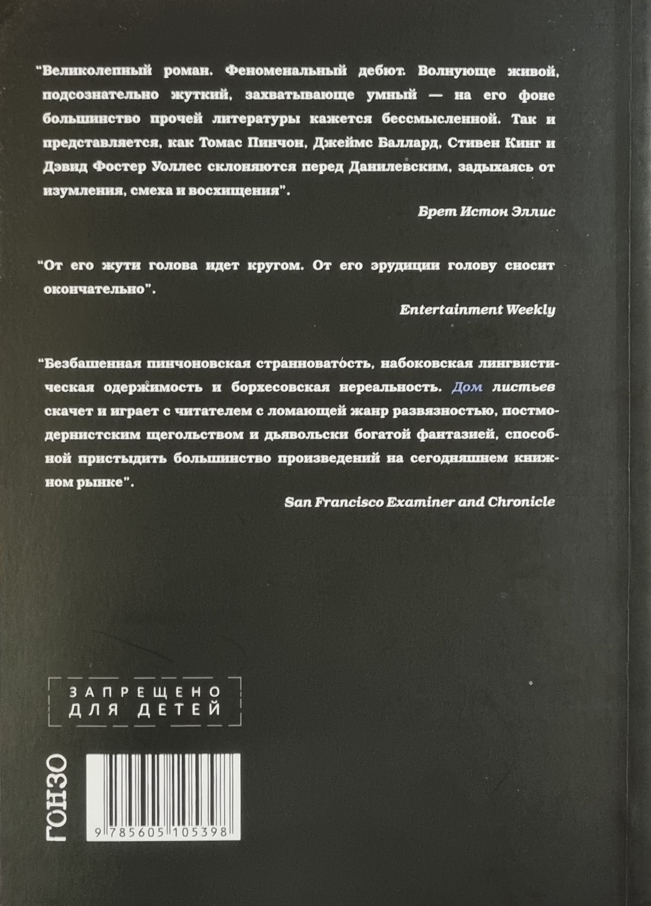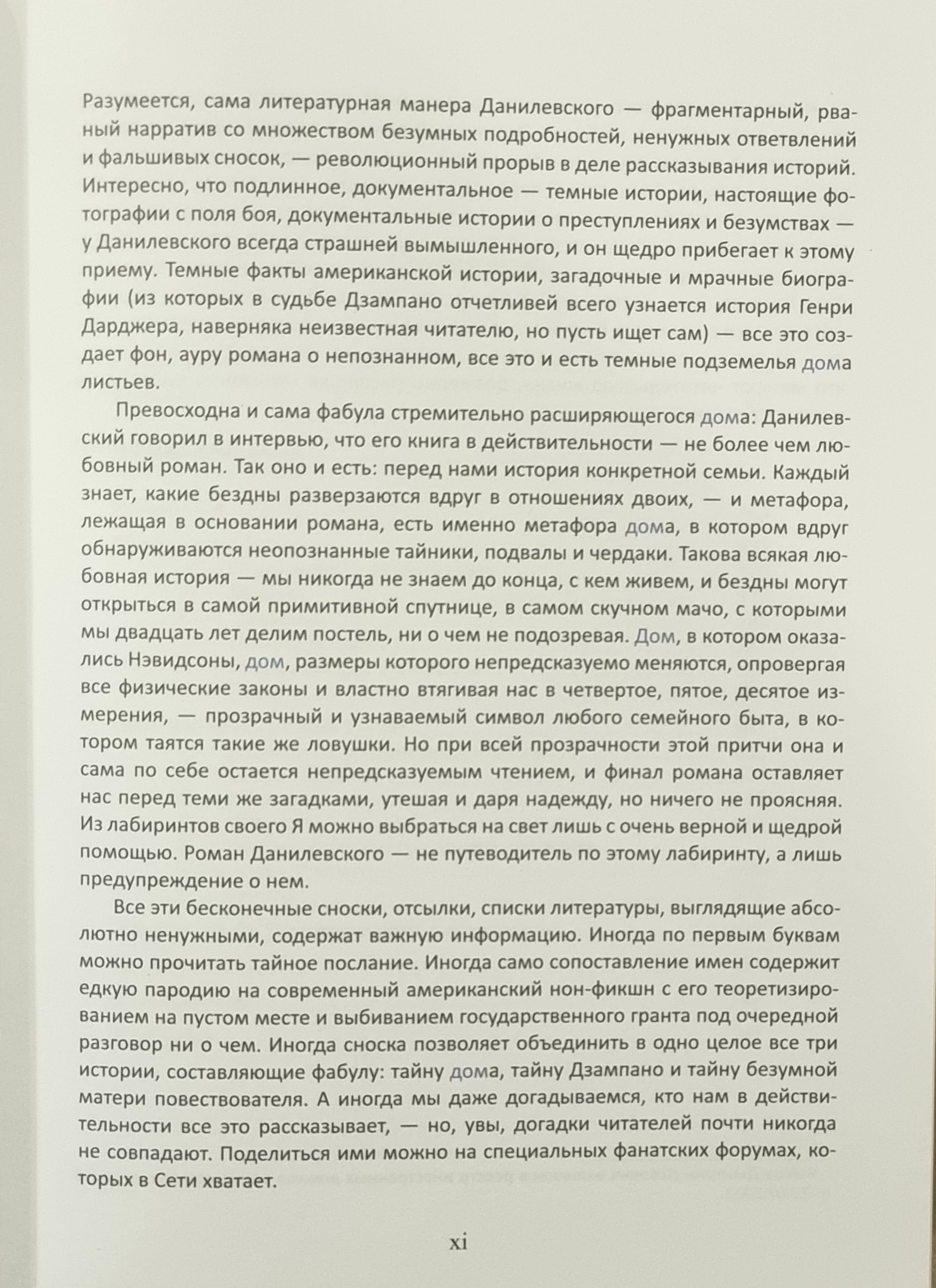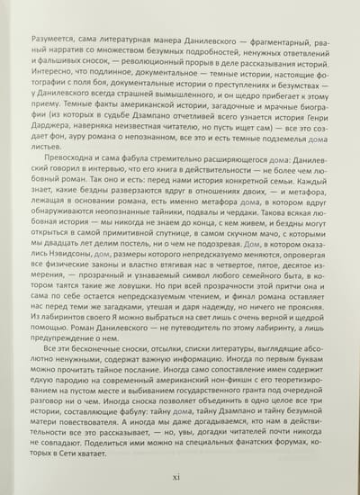 Роман ужасов о стремительно расширяющемся доме; история о силе любви; сатира на псевдонаучные спекуляции; фундаментальное исследование о фильме, которого не существует, сделанное слепым стариком; записки из лабиринтов подсознания; сентиментальное блуждание по инфернальным кругам жизни - все это в бесконечном переплетении создает единый сюжет «Дома листьев».
