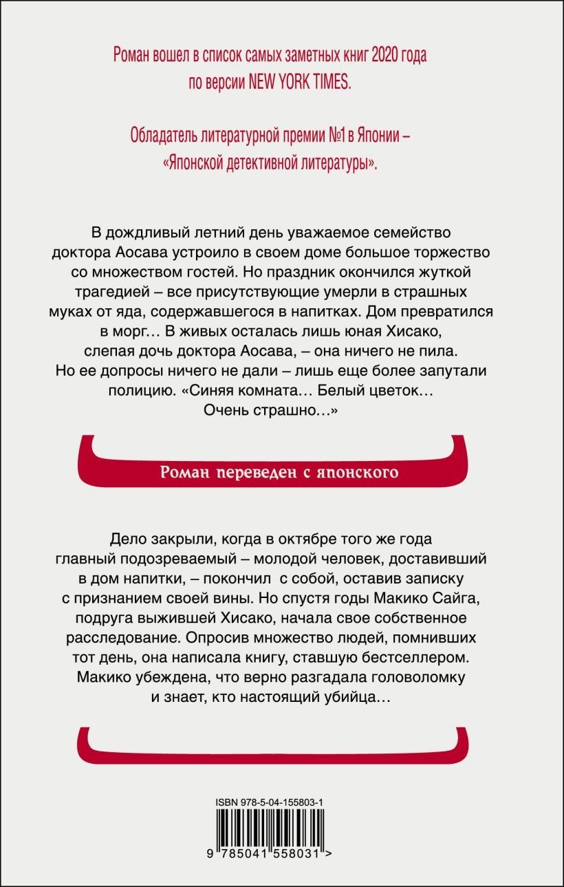 В дождливый летний день уважаемое семейство доктора Аосава устроило в своем доме большое торжество с множеством гостей. Но праздник окончился жуткой трагедией – все присутствующие умерли в страшных муках от яда, содержавшегося в напитках. Дом превратился в морг… В живых осталась лишь юная Хисако, слепая дочь доктора Аосава, – она ничего не пила. Но ее допросы ничего не дали – лишь еще более запутали полицию. «Синяя комната… Белый цветок… Очень страшно…» Дело закрыли, когда в октябре того же года главный подозреваемый – молодой человек, доставивший в дом напитки – покончил с собой, оставив записку с признанием своей вины. Но спустя годы Макико Сайга, подруга выжившей Хисако, начала свое собственное расследование. Опросив множество людей, помнивших тот день, она написала книгу, ставшую бестселлером. Макико убеждена, что верно разгадала головоломку и знает, кто настоящий убийца…