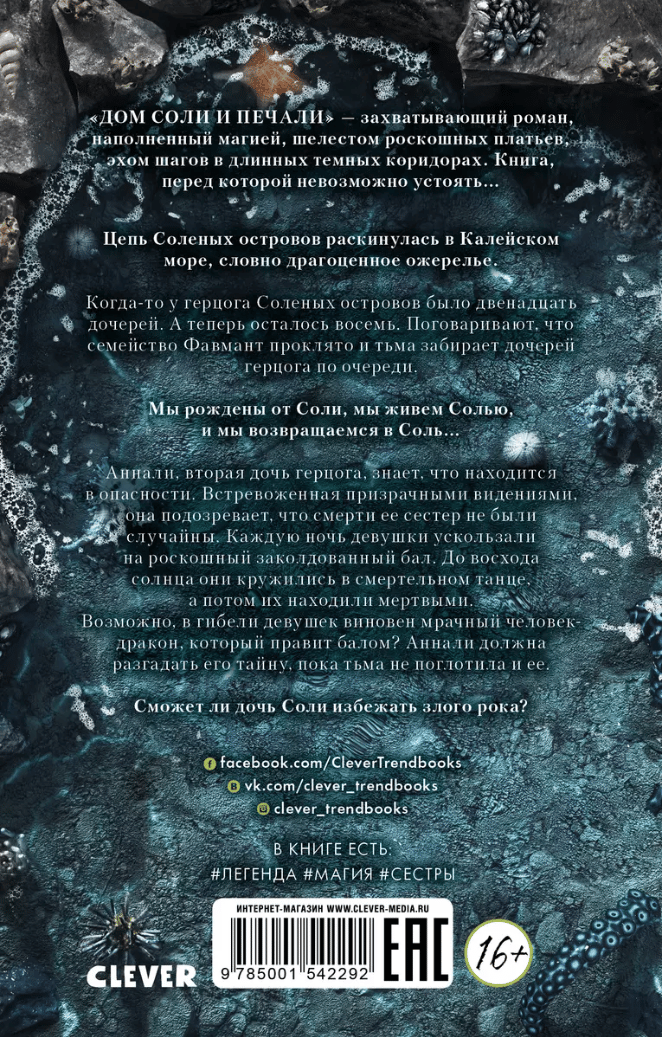 В морском царстве, в сказочном государстве прокляты двенадцать сестер... так начинается сюжет бестселлера Э. Крейг.  Цепь Соленых островов раскинулась в Калейском море, словно драгоценное ожерелье.  Когда-то у герцога Соленых островов было двенадцать дочерей. А теперь осталось всего восемь. Поговаривают, что семейство Фавмант проклято, и тьма забирает дочерей герцога по очереди.  Мы рождены от Соли, мы живем Солью и мы возвращаемся в Соль...  Главная героиня книги «Дом соли и печали» - Аннали, вторая дочь герцога. Она знает, что находится в опасности. Встревоженная призрачными видениями, девушка подозревает, что смерти ее близких не были случайны. Каждую ночь сестры ускользали на роскошный заколдованный бал. До восхода солнца они кружились в смертельном танце, а потом их находили мертвыми.  Возможно, в гибели девушек виновен мрачный человек-дракон, который правит балом? Аннали должна разгадать его тайну, пока тьма не поглотила ее.  Сможет ли дочь Соли избежать злого рока?