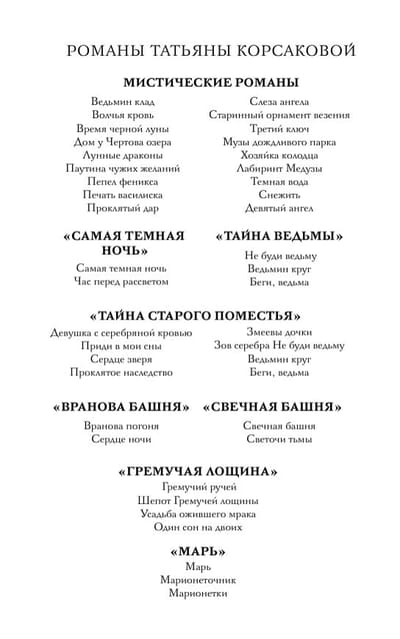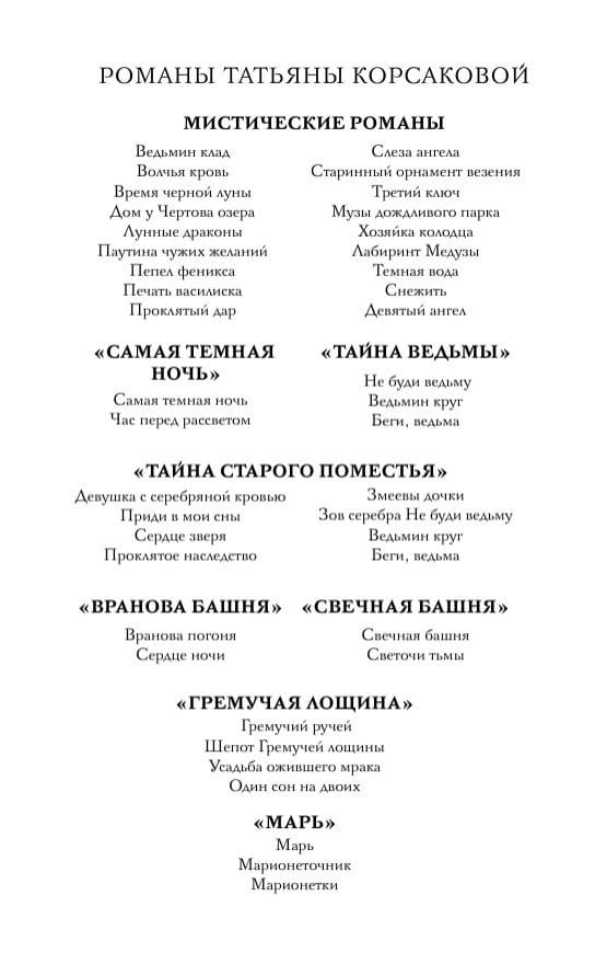 Татьяна Корсакова — популярный автор любовно-авантюрных романов с элементами мистики. Из-под ее пера вышло более двух десятков книг. Сюжеты рождаются из городских легенд, народных сказаний, древних книг и собственной буйной фантазии.