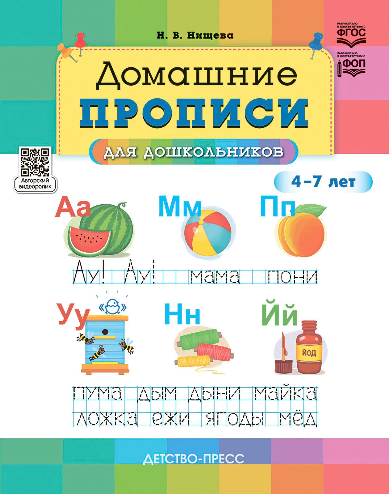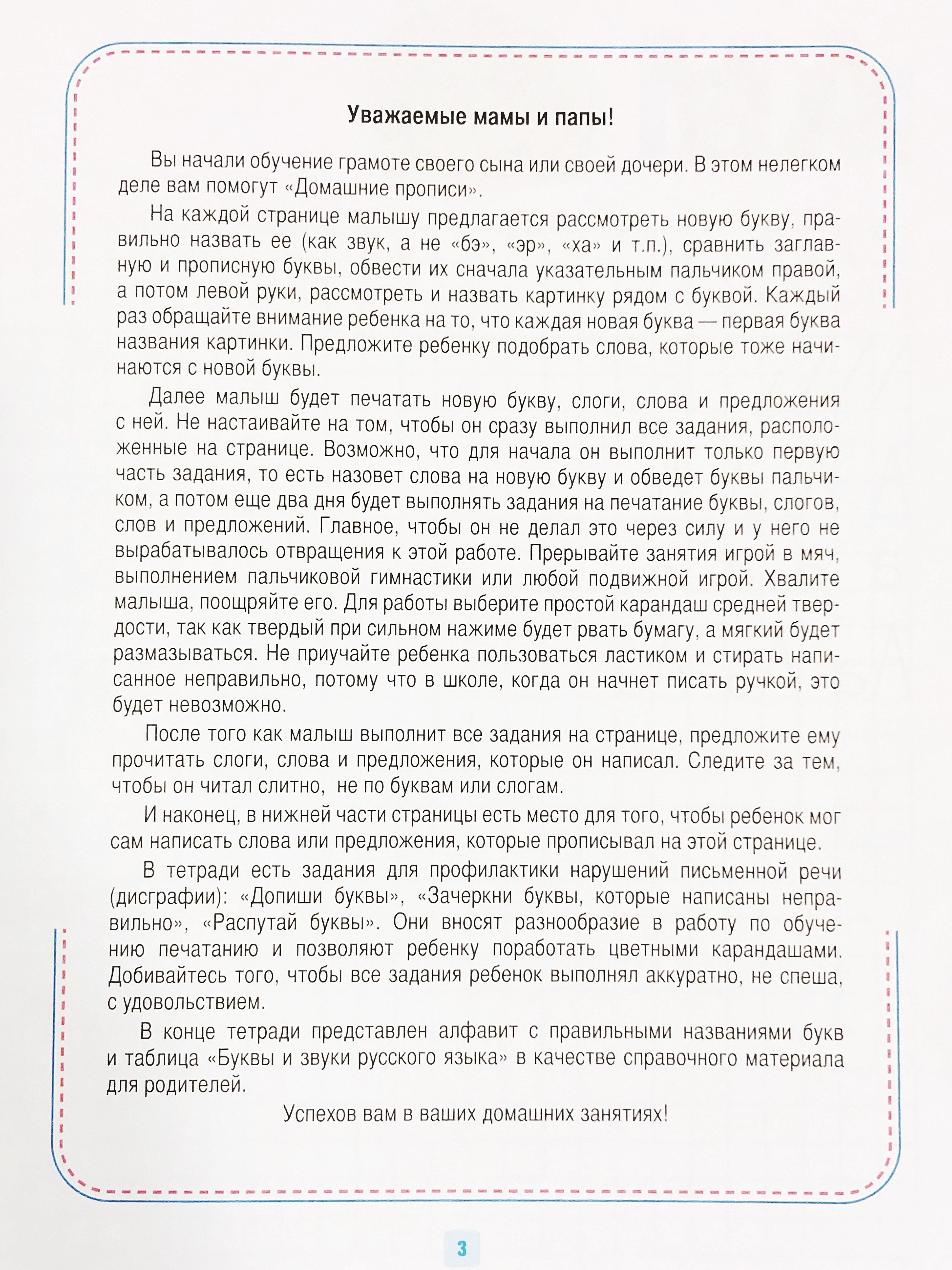 Прописи для дошкольников содержат задания для развития мелкой моторики, формирования навыка печатания букв русского алфавита, слов и слогов с ними, создания условий для формирования графомоторных навыков и профилактики нарушений письменной речи (дисграфии). Каждая страница пособия рассчитана на два – три дня работы с ребенком. Рекомендованы для домашних занятий с детьми дошкольного возраста с 4 до 7 лет.