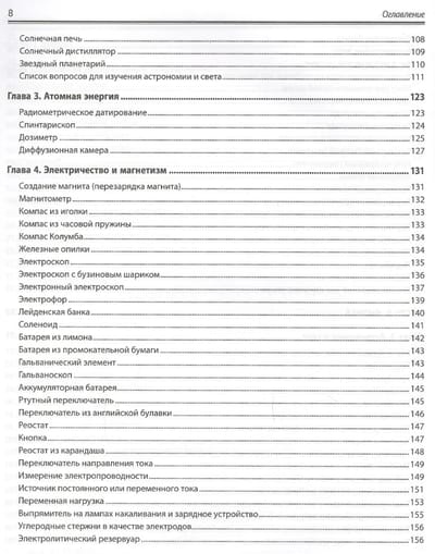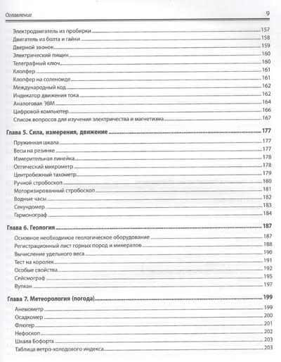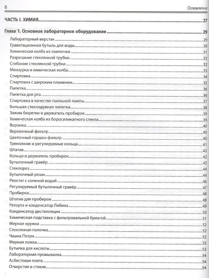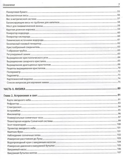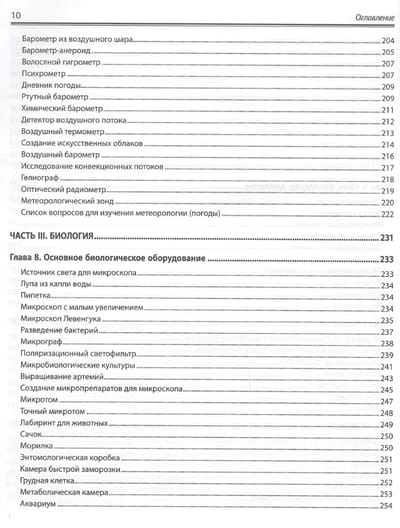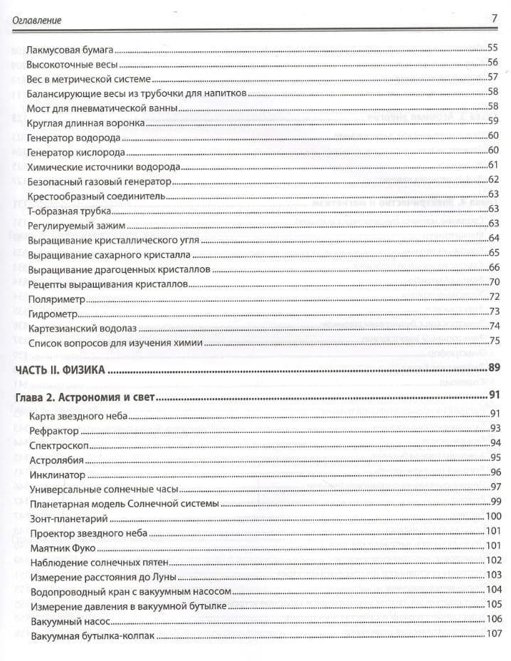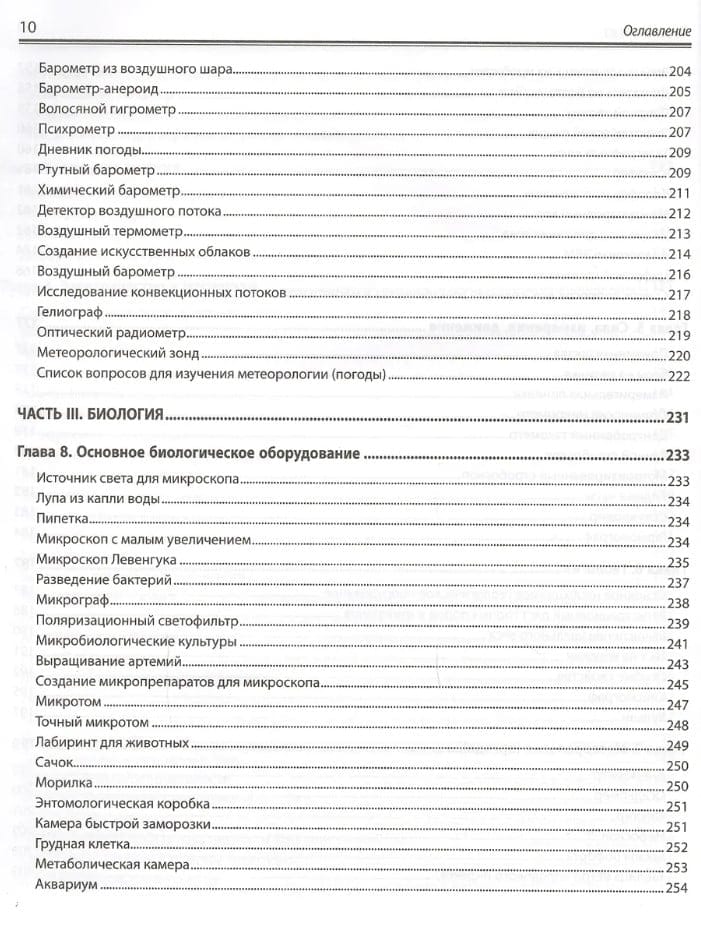 Рассказано, как оборудовать домашнюю лабораторию, сконструировать приборы для исследований по химии, биологии и физике и провести с их помощью эксперименты. Показано, как изготовить собственную лабораторную посуду, камеру Вильсона для обнаружения космического излучения, микроскопы с увеличением от 25. до 160. , барометры, термометры и гигрометры, магниты, моторы, батареи и конденсаторы, микротом, анемометр и сейсмограф, телескоп, спектроскоп и нефоскоп, генераторы кислорода и водорода, гелиограф Кэмпбелла–Стокса и др. Описано проведение более 1600 экспериментов: добыча водорода, выращивание кристаллов, обнаружение жизни в капле воды, измерение всевозможных величин (от массы до электропроводности, скорости метаболизма или космического излучения), создание электрического двигателя, наблюдение за спутниками Юпитера, постановка и решение многих других увлекательных научных задач.