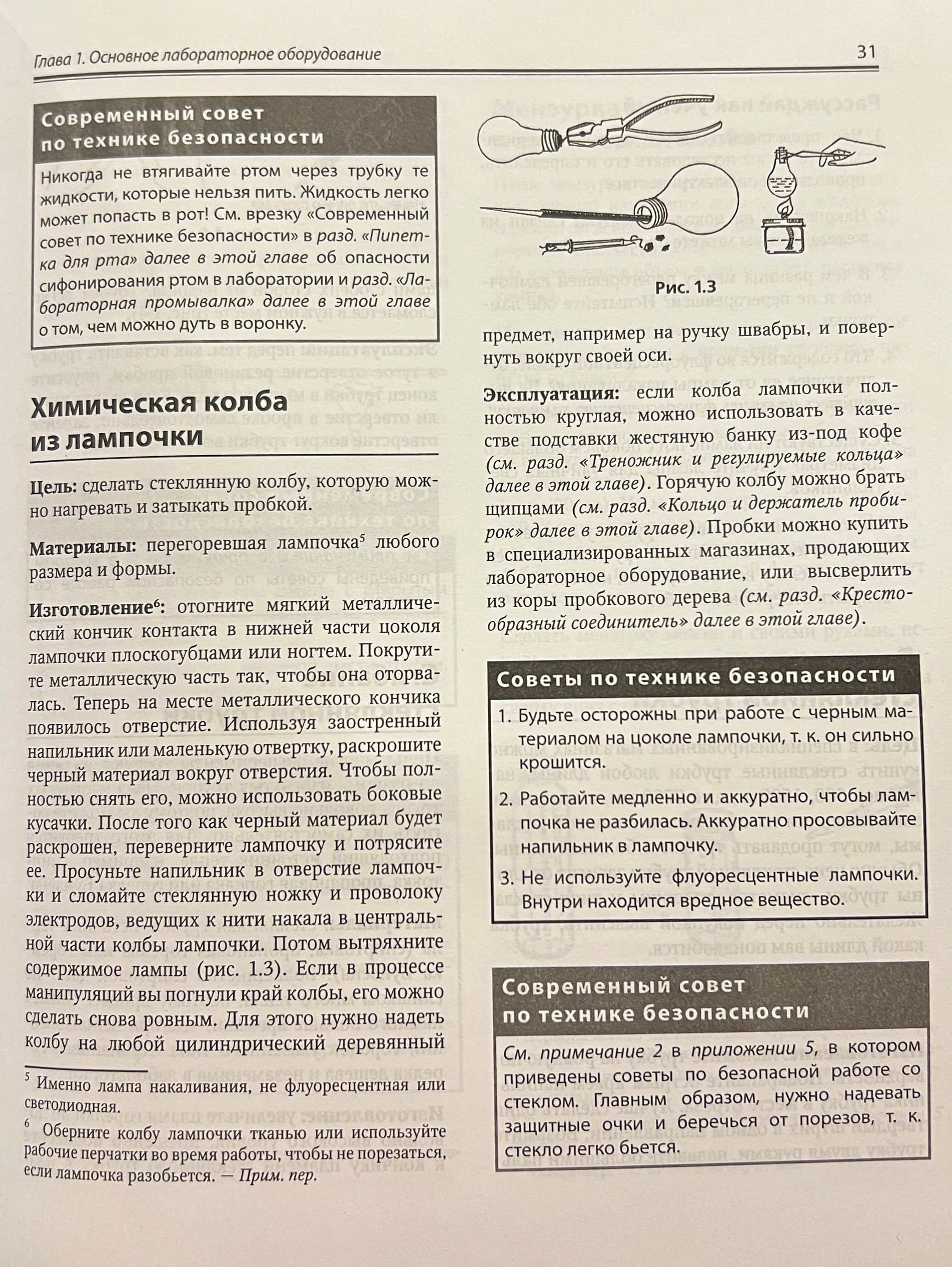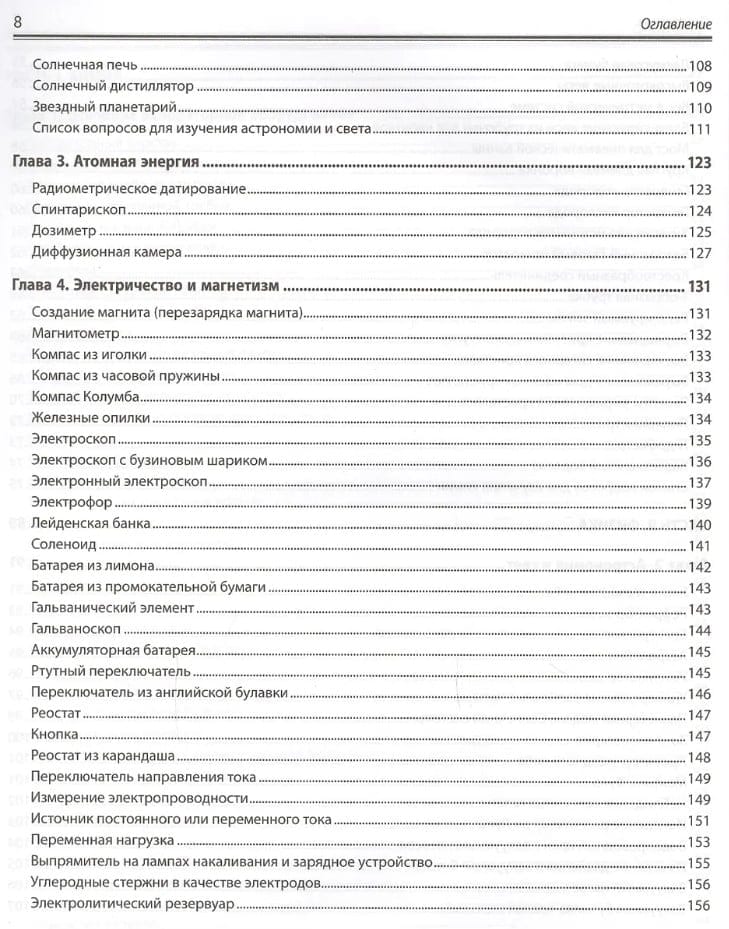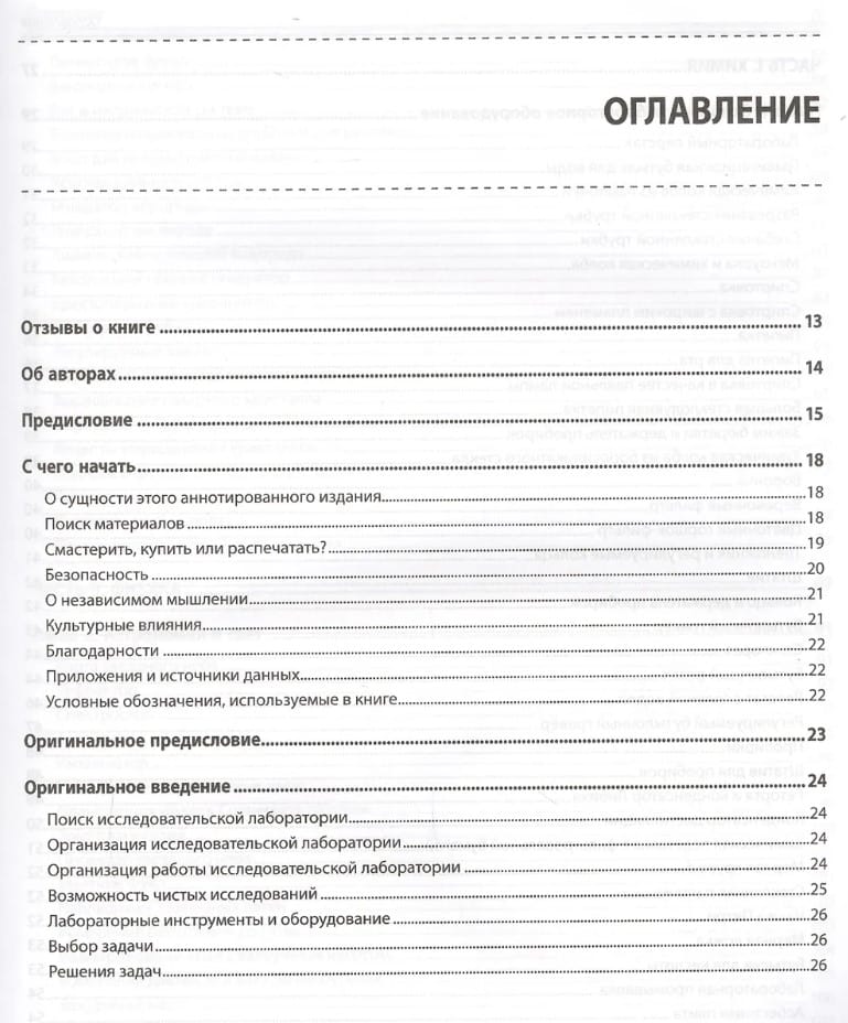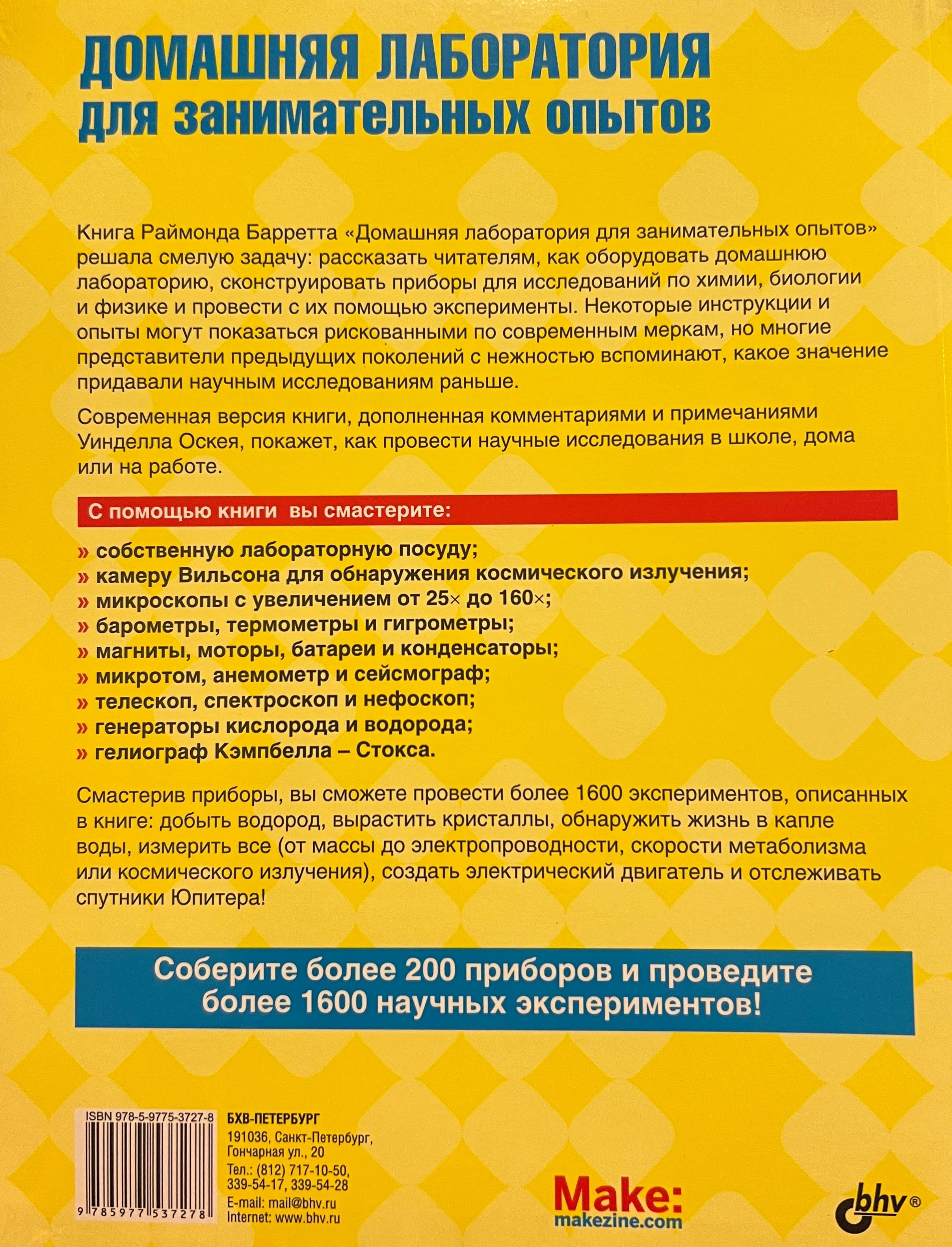 Рассказано, как оборудовать домашнюю лабораторию, сконструировать приборы для исследований по химии, биологии и физике и провести с их помощью эксперименты. Показано, как изготовить собственную лабораторную посуду, камеру Вильсона для обнаружения космического излучения, микроскопы с увеличением от 25. до 160. , барометры, термометры и гигрометры, магниты, моторы, батареи и конденсаторы, микротом, анемометр и сейсмограф, телескоп, спектроскоп и нефоскоп, генераторы кислорода и водорода, гелиограф Кэмпбелла–Стокса и др. Описано проведение более 1600 экспериментов: добыча водорода, выращивание кристаллов, обнаружение жизни в капле воды, измерение всевозможных величин (от массы до электропроводности, скорости метаболизма или космического излучения), создание электрического двигателя, наблюдение за спутниками Юпитера, постановка и решение многих других увлекательных научных задач.