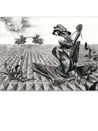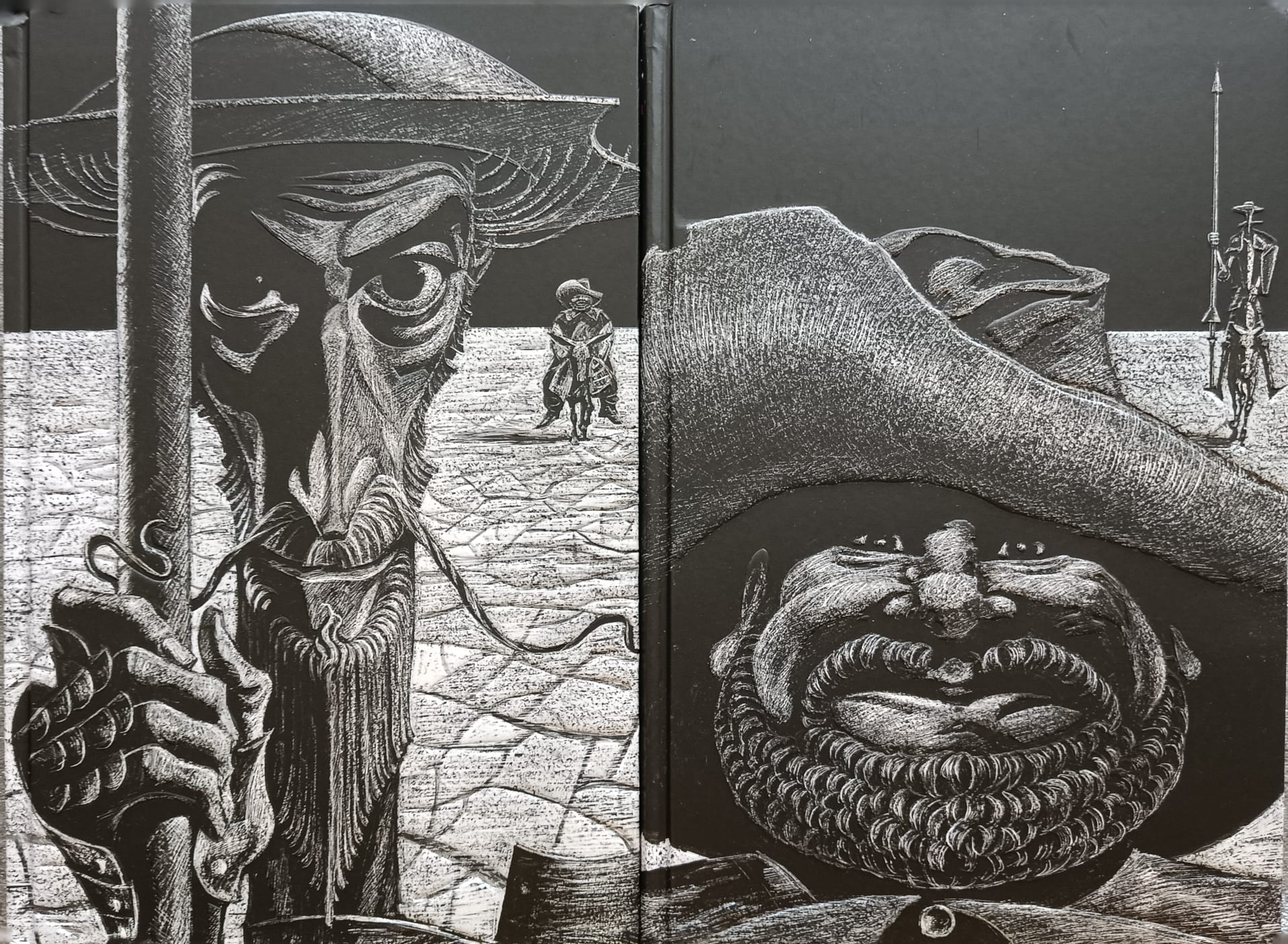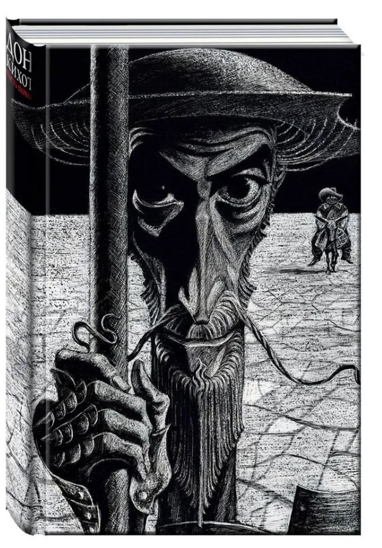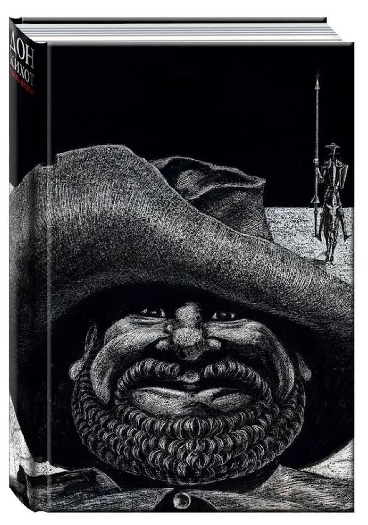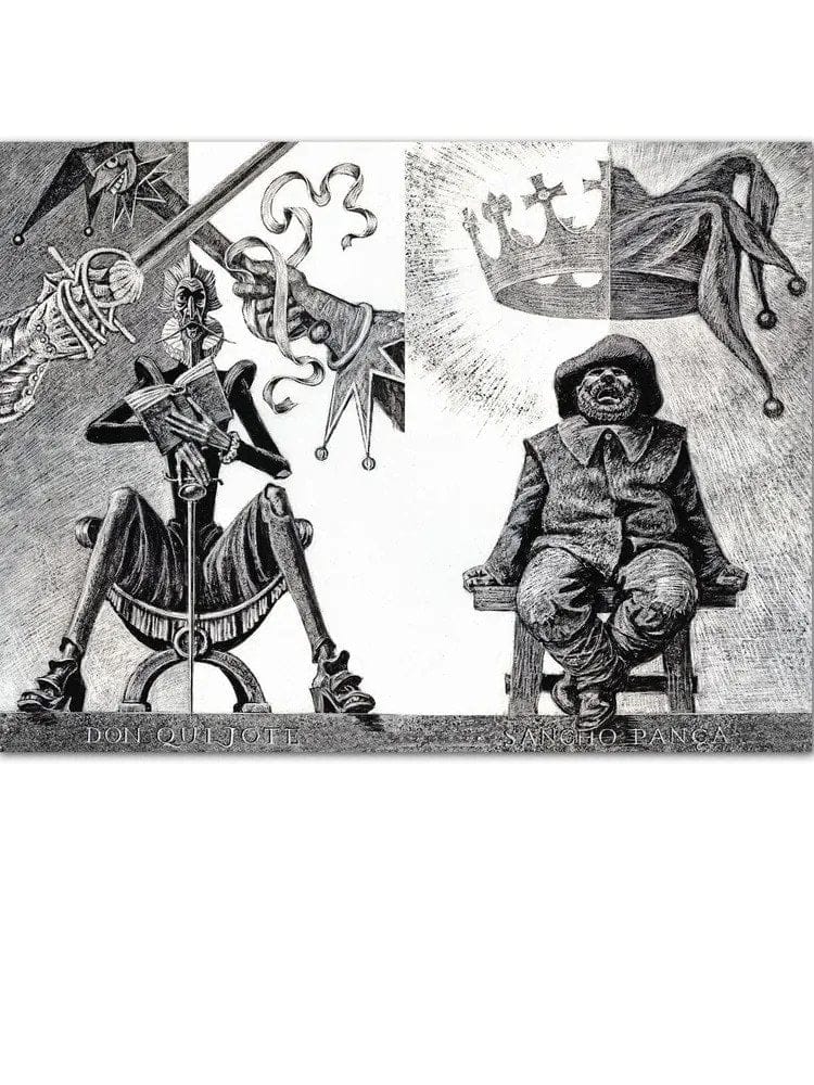 Роман Сервантеса «Дон Кихот» по-прежнему остаётся одной из самых издаваемых в мире книг, по числу языков, на которые он переведён, роман уступает только Библии. В конце 1960-х годов художник Савва Бродский взялся, как он сам выразился, за тысячную вариацию иллюстрирования романа и снова стал промывать великую книгу в своём сердце, как золотоносный песок (рисовать героев Сервантеса художник начинал ещё школьником). Что важно и необычайно ценно - Бродский не разделил мир, как принято, на дон кихотов и санчо панс. По его изобразительной версии, один Дон Кихот или один Санчо существовать не могут, как не может существовать только одна сторона медали. За экзальтированным рыцарем неотступно следует сметливый оруженосец: один олицетворяет идею, другой - её практическое использование. Но в иллюстрациях Бродского присутствует и третье действующее лицо - растресканная земля, уходящая в беспощадную даль. В этой пустыне человеческой и зародилась светлая вера Дон Кихота в истину, требующую служения и жертв...