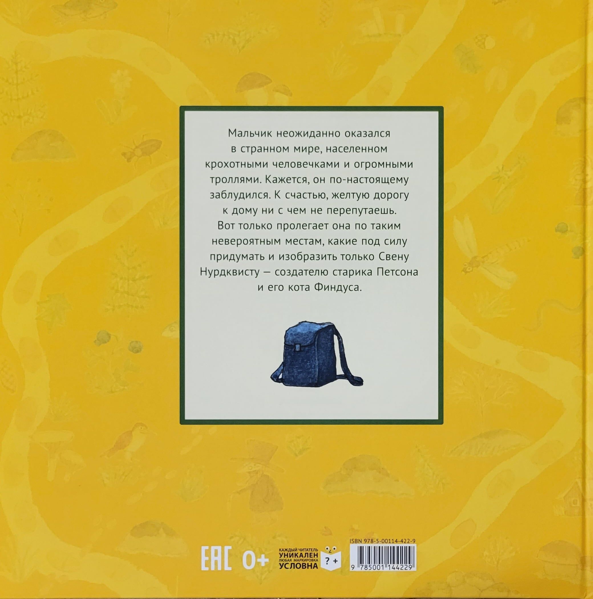 Мальчик очутился в незнакомом месте и не понимает, ни как сюда попал, ни как вернуться назад. Но на подмогу приходят маленькие человечки и Справочная бабушка. Важно все время следовать за желтой полоской: она обязательно выведет к дому. Желтая дорога вьется между скал, где странные жирафы травят анекдоты, ныряет в лес, населенный добрыми троллями, приводит в пустыню, уставленную кораблями и лодками, и превращается в желтую реку - а дальше и море, и остров, и замок принцессы, и лабиринт. На каждом повороте мальчика поджидают не только опасности, но и добрые помощники - то хулиганистые галки, то суровый капитан подводной лодки, то говорящий пес, то художница, рисующая волшебные картины. А в случае чего выручает подаренный человечками необыкновенный рюкзак.