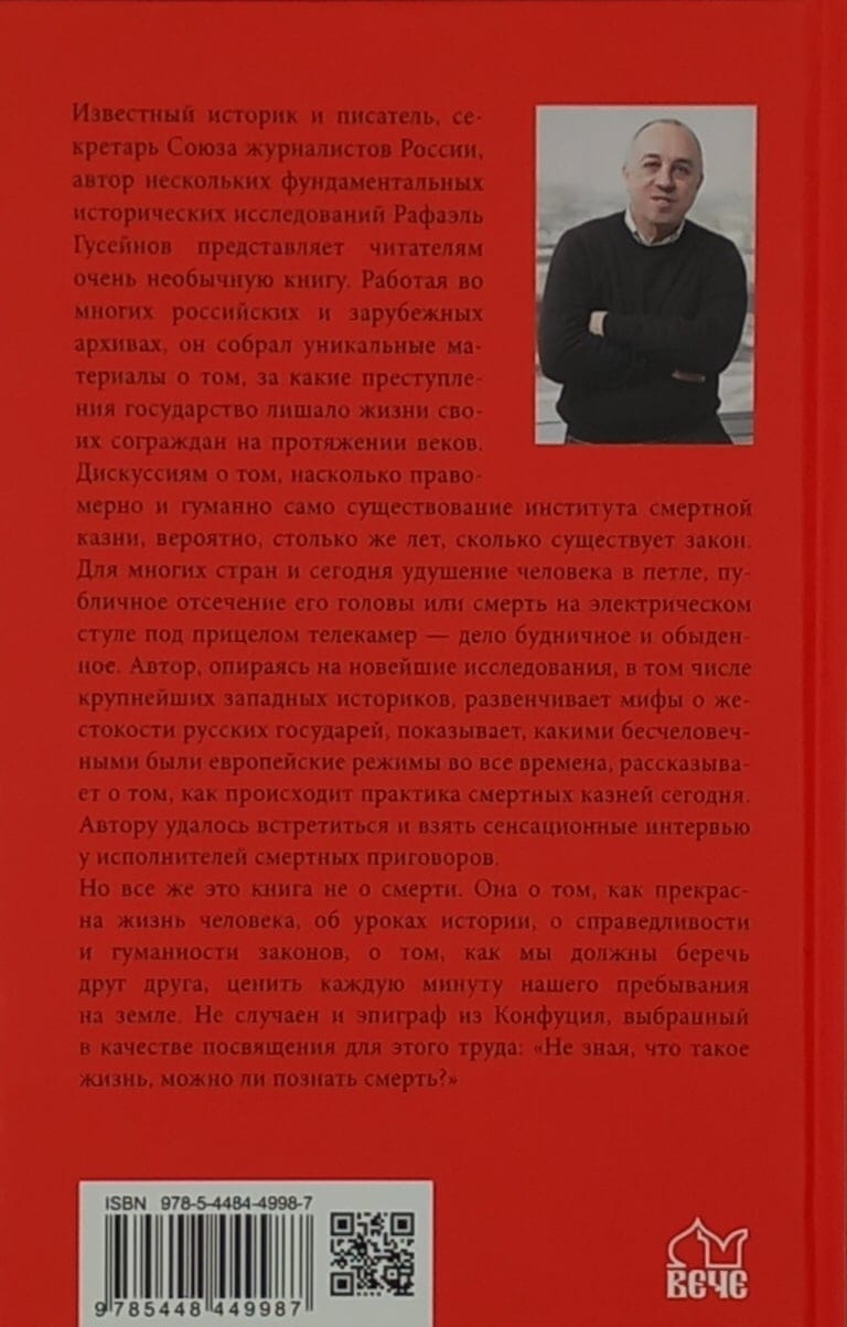Известный историк и писатель Рафаэль Гусейнов представляет читателям очень необычную книгу. Работая во многих российских и зарубежных архивах, он собрал уникальные материалы о том, за какие преступления государство лишало жизни своих сограждан на протяжении веков. Дискуссиям о том, насколько правомерно и гуманно само существование института смертной казни, вероятно, столько же лет сколько существует закон. Для многих стран и сегодня удушение человека в петле, публичное отсечение его головы или смерть на электрическом стуле под прицелом телекамер - дело будничное и обыденное. Автор, опираясь на новейшие исследования, в том числе крупнейших западных историков, развенчивает мифы о жестокости русских государей, показывает какими бесчеловечными были европейские режимы во все времена, рассказывает о том, как происходит практика смертных казней сегодня. Автору удалось встретиться и взять сенсационные интервью у исполнителей смертных приговоров.