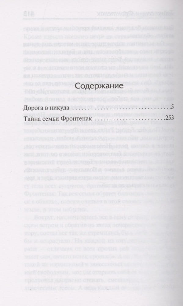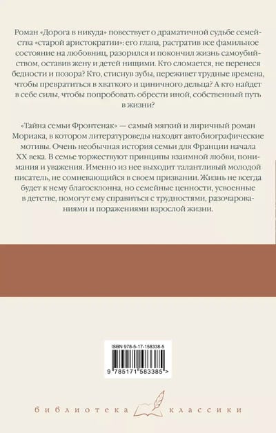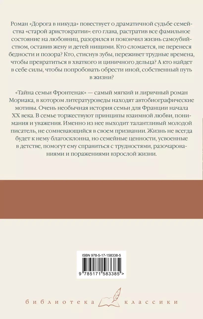 Роман «Дорога в никуда» повествует о драматичной судьбе семейства «старой аристократии», его глава, растратив все фамильное состояние на любовниц, разорился и покончил жизнь самоубийством, оставив жену и детей нищими. Кто сломается, не перенеся бедности и позора? Кто, стиснув зубы, переживет трудные времена, чтобы превратиться в хваткого и циничного дельца? А кто найдет в себе силы, чтобы попробовать обрести иной, собственный путь в жизни?«Тайна семьи Фронтенак» — самый мягкий и лиричный роман Мориака, в котором литературоведы находят автобиографические мотивы. Очень необычная история семьи для Франции начала ХХ века. В семье торжествуют принципы взаимной любви, понимания и уважения. Именно из нее выходит талантливый молодой писатель, не сомневающийся в своем призвании. Жизнь не всегда будет к нему благосклонна, но семейные ценности, усвоенные в детстве, помогут ему справиться с трудностями, разочарованиями и поражениями взрослой жизни.
