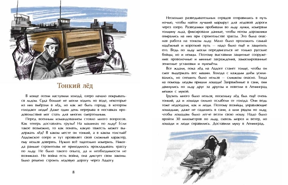 Есть среди дорог такая, что никогда не будет забыта, — Дорога жизни. В самые тяжёлые времена она соединяла два берега Ладожского озера и была единственной надеждой на спасение для жителей блокадного Ленинграда. От неё зависели жизнь, смерть и победа над врагом. В этой книге мы расскажем о Дороге жизни, о подвиге людей, которые её создали, о человеческой отваге и большой любви.