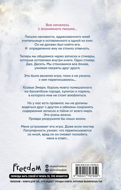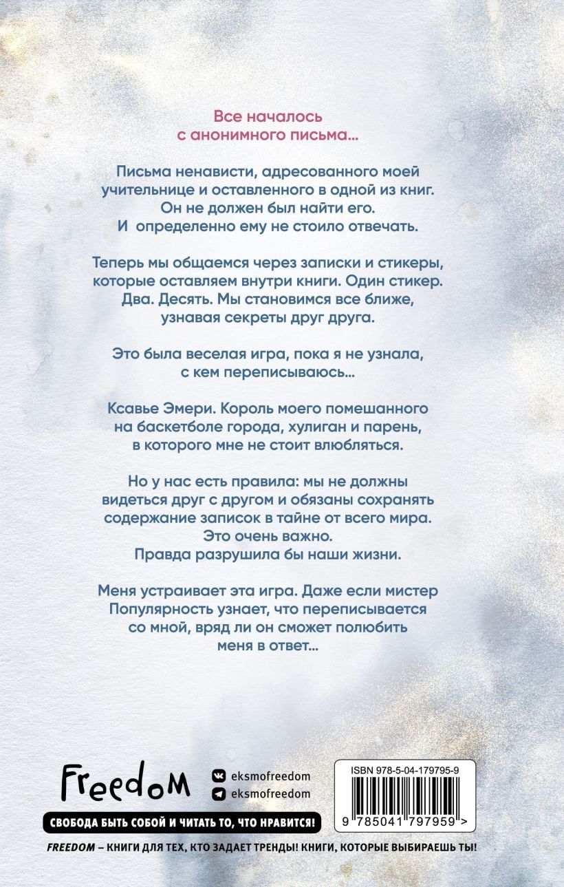 Ксавье — капитан баскетбольной команды и «король» школы. Ви — прилежная ученица, потерявшая отца. Они из разных миров, которые не должны были пересекаться, но однажды все изменилось... Все началось с анонимного письма… Письма ненависти, адресованного моей учительнице и оставленного в одной из книг. Он не должен был найти его. И определенно ему не стоило отвечать. Теперь мы общаемся через записки и стикеры, которые оставляем внутри книги. Один стикер. Два. Десять. Мы становимся все ближе, узнавая секреты друг друга. Это была веселая игра, пока я не узнала, с кем переписываюсь… Ксавье Эмери. Король моего помешанного на баскетболе города, хулиган и парень, в которого мне не стоит влюбляться. Но у нас есть правила: мы не должны видеться друг с другом и обязаны сохранять содержание записок в тайне от всего мира. Это очень важно. Правда разрушила бы наши жизни. Меня устраивает эта игра. Даже если мистер Популярность узнает, что переписывается со мной, вряд ли он сможет полюбить меня в ответ…