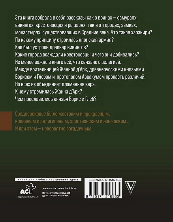 Эта книга вобрала в себя рассказы как о воинах – самураях, викингах, крестоносцах и рыцарях, так и о городах, замках, монастырях, существовавших в Средние века. Что такое харакири? По какому принципу строилась японская армия? Как был устроен драккар викингов? Какие города осаждали крестоносцы и чего они добивались?