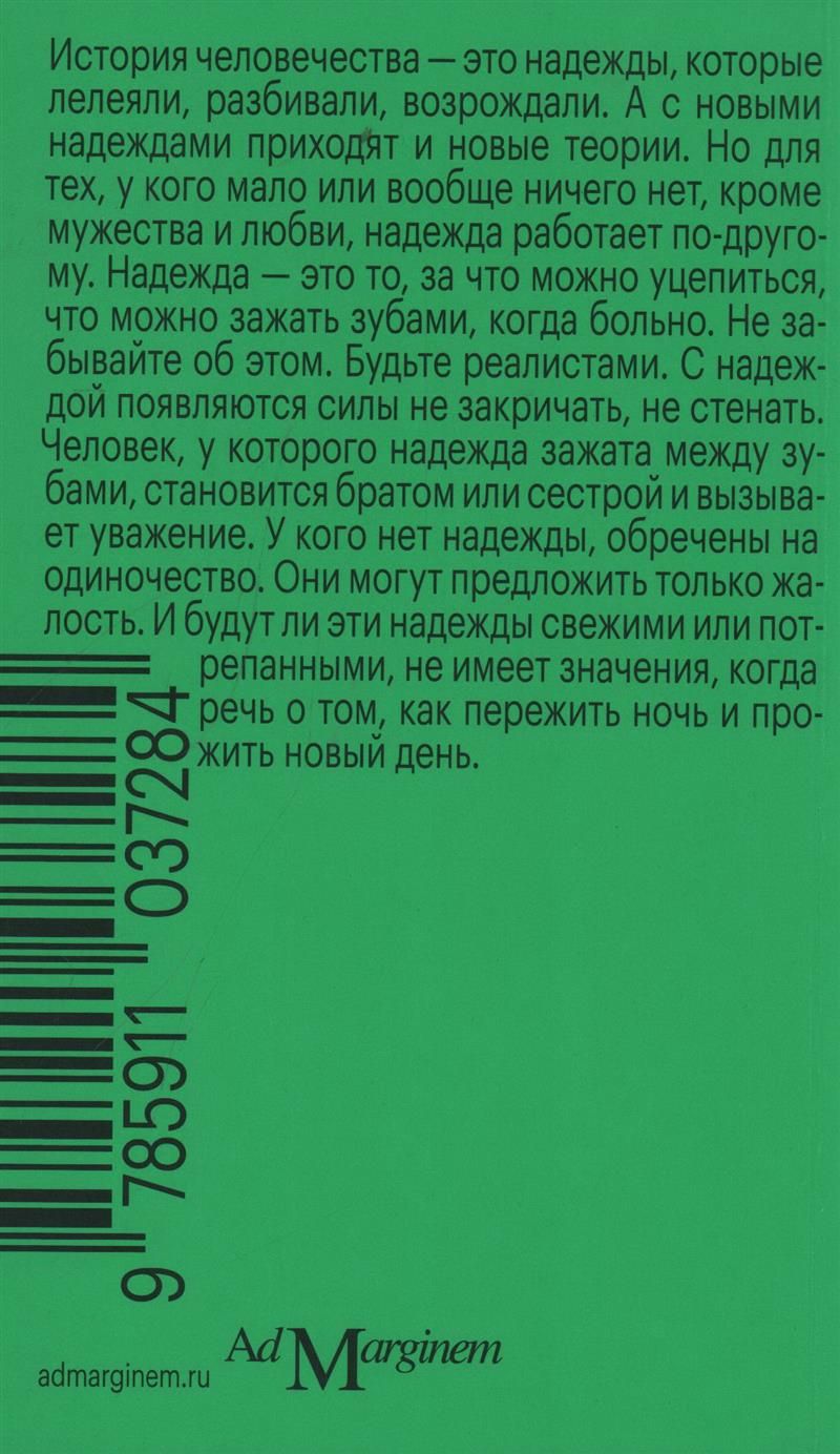 В этом сборнике эссе писатель, критик, поэт и художник Джон Бёрджер (1926–2017) рассуждает об ужасах современных войн, терроризме и природе всепоглощающего отчаяния. На страницах книги он демонстрирует нам жизнь людей, для которых это чувство стало верным спутником — бедняков и беженцев из Афганистана, Палестины, Ирака, Сирии, — и предлагает разделить их траур по отнятой насильно свободе. Обращаясь к сюжетам фильмов Паоло Пазолини, работам Фрэнсиса Бэкона, фотографиям Ахлам Шибли и Йитки Ханзловой и вспоминая «Смотрим на чужие страдания» Сьюзен Сонтаг, Бёрджер анализирует, как искусство в качестве инструмента сопротивления репрессивной политике может помочь одержать победу над болью, страхом и ненавистью.