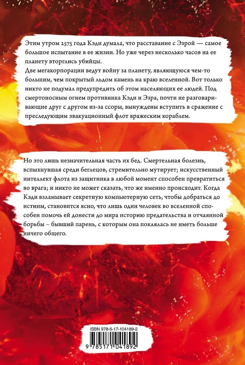 Две мегакорпорации ведут войну за планету, являющуюся чем‑то большим, чем покрытый льдом камень на краю вселенной. Вот только никто не подумал предупредить об этом населяющих ее людей. Под смертоносным огнем противника Кэди и Эзра, почти не разговаривающие с друг другом из‑за ссоры, вынуждены вступить в сражение с преследующим эвакуационный флот вражеским кораблем. Но это лишь незначительная часть их бед. Смертельная болезнь, вспыхнувшая среди беглецов, стремительно мутирует; искусственный интеллект флота из защитника в любой момент способен превратиться во врага; и никто не может сказать, что же именно присходит. Когда Кэди взламывает секретную компьютерную сеть, чтобы добраться до истины, становится ясно, что лишь один человек во вселенной способен помочь ей донести до мира историю предательства и отчаянной борьбы — бывший парень, с которым она поклялась не иметь больше ничего общего.
