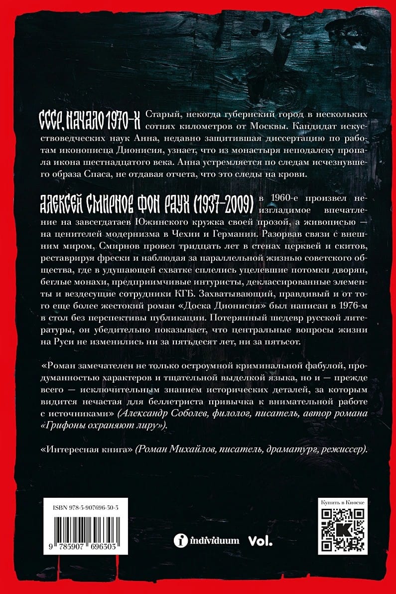 Алексей Смирнов фон Раух (1937-2009) в 1960-е произвел неизгладимое впечатление на завсегдатаев Южинского кружка своей прозой, а живописью - на ценителей модернизма в Чехии и Германии. Разорвав связи с внешним миром, Смирнов провел тридцать лет в стенах церквей и скитов, реставрируя фрески и наблюдая за параллельной жизнью советского общества, где в удушающей схватке сплелись уцелевшие потомки дворян, беглые монахи, предприимчивые интуристы, деклассированные элементы и вездесущие сотрудники КГБ. Захватывающий, правдивый и оттого еще более жестокий роман «Доска Дионисия» был написан в 1976-м в стол без перспективы публикации. Потерянный шедевр русской литературы, он убедительно показывает, что центральные вопросы жизни на Руси не изменились ни за пятьдесят лет, ни за пятьсот.