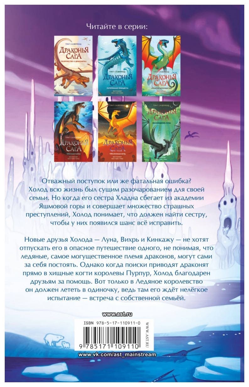 Отважный поступок или же фатальная ошибка? Холод всю жизнь был сущим разочарованием для своей семьи. Но когда его сестра Хладна сбегает из академии Яшмовой горы и совершает множество страшных преступлений, Холод понимает, что должен найти сестру, чтобы у них появился шанс всё исправить. Новые друзья Холода — Луна, Вихрь и Кинкажу — не хотят отпускать его в опасное путешествие одного, не понимая, что ледяные, самое могущественное племя драконов, могут сами за себя постоять. Однако когда поиски приводят драконят прямо в хищные когти королевы Пурпур, Холод благодарен друзьям за помощь. Вот только в Ледяное королевство он должен лететь в одиночку, ведь там его ждёт нелёгкое испытание — встреча с собственной семьёй.