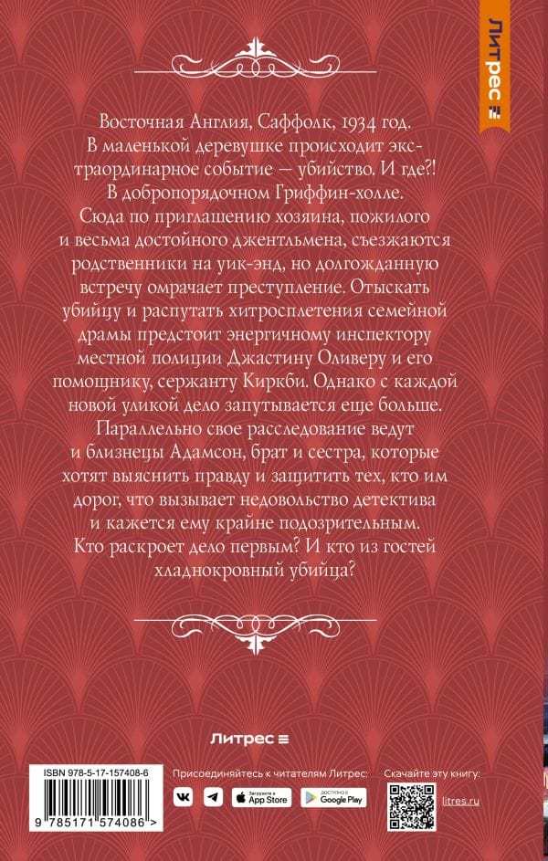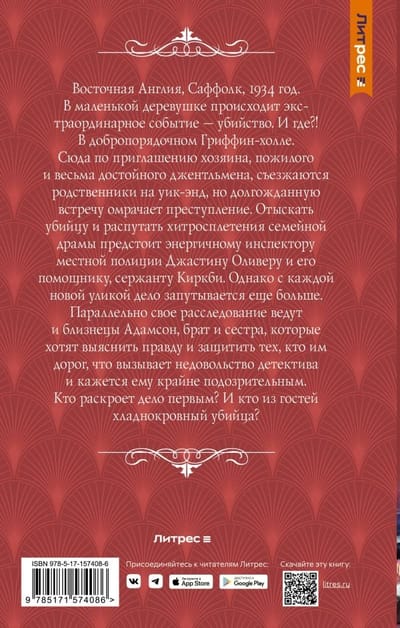 Восточная Англия, Саффолк, 1934 год. В маленькой деревушке происходит экстраординарное событие — убийство. И где?! В добропорядочном Гриффин холле. Сюда по приглашению хозяина, пожилого и весьма достойного джентльмена, съезжаются родственники на уик-энд, но долгожданную встречу омрачает преступление. Отыскать убийцу и распутать хитросплетения семейной драмы предстоит энергичному инспектору местной полиции Джастину Оливеру и его помощнику, сержанту Киркби. Однако с каждой новой уликой дело запутывается еще больше. Параллельно свое расследование ведут и близнецы Адамсон, брат и сестра, которые хотят выяснить правду и защитить тех, кто им дорог, что вызывает недовольство детектива и кажется ему крайне подозрительным. Кто раскроет дело первым? И кто из гостей хладнокровный убийца?